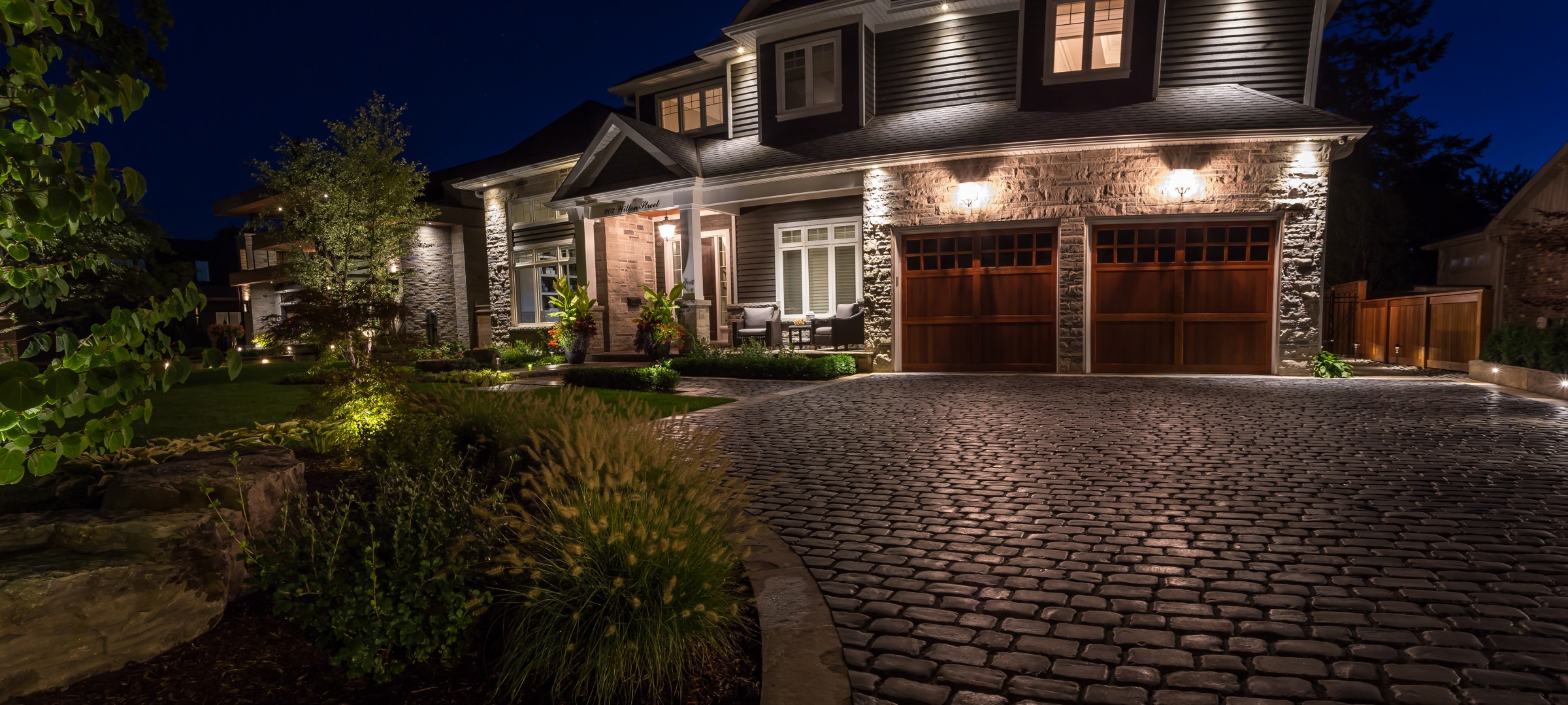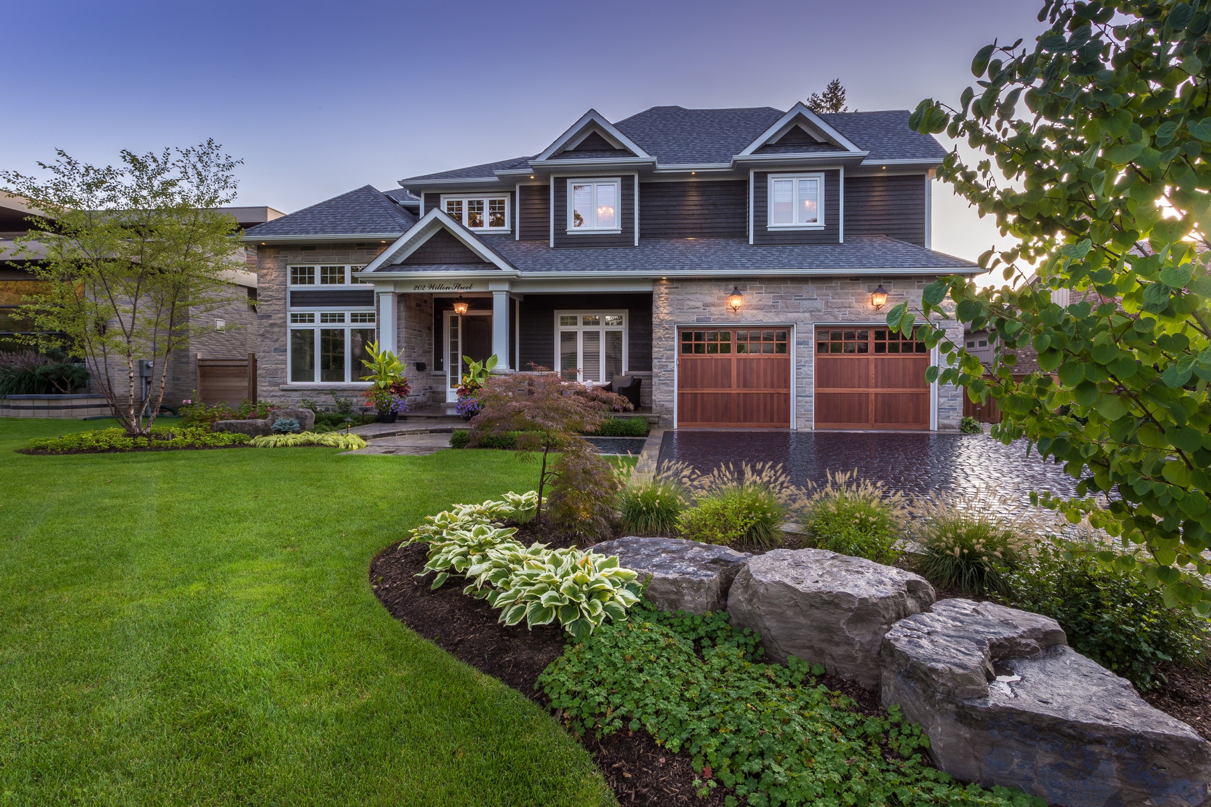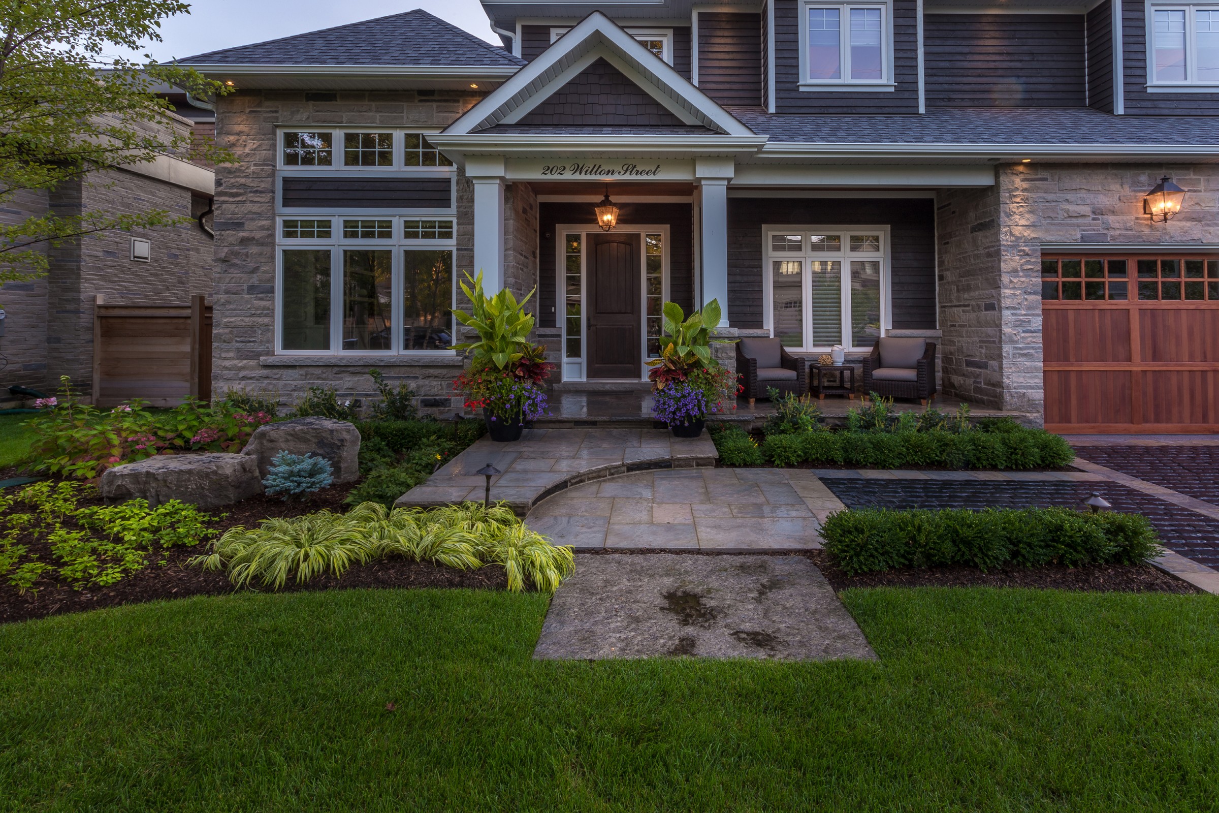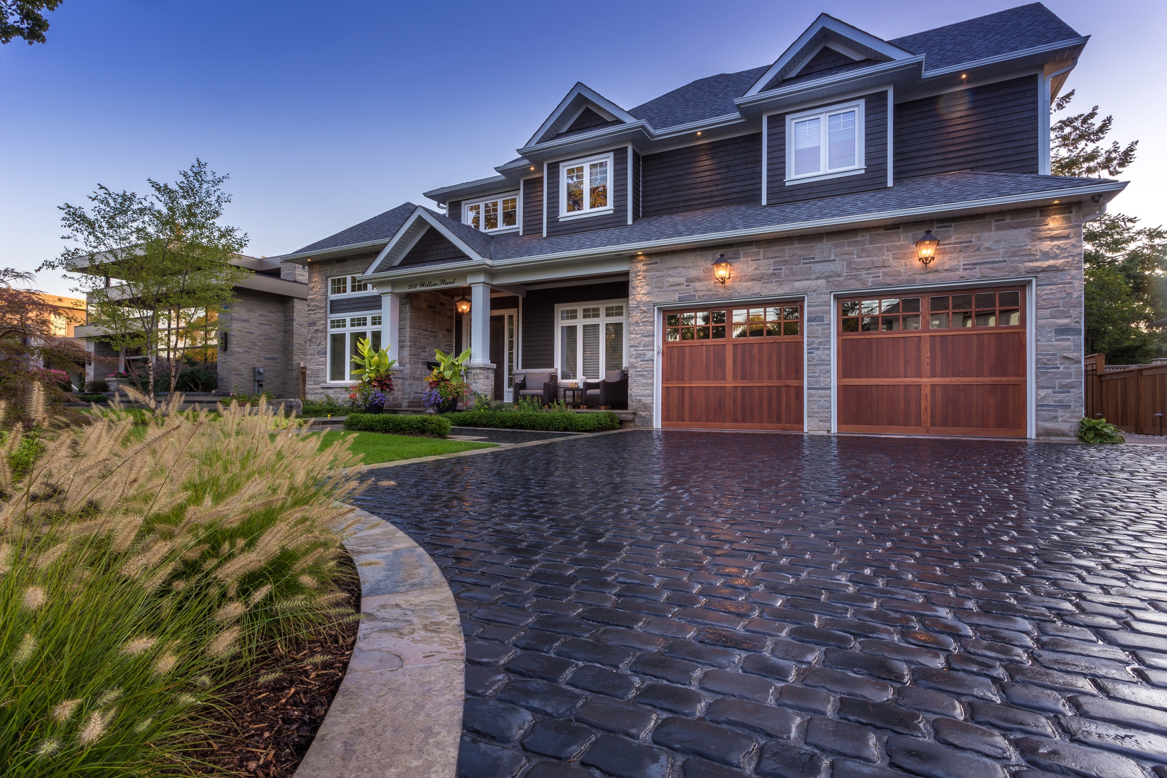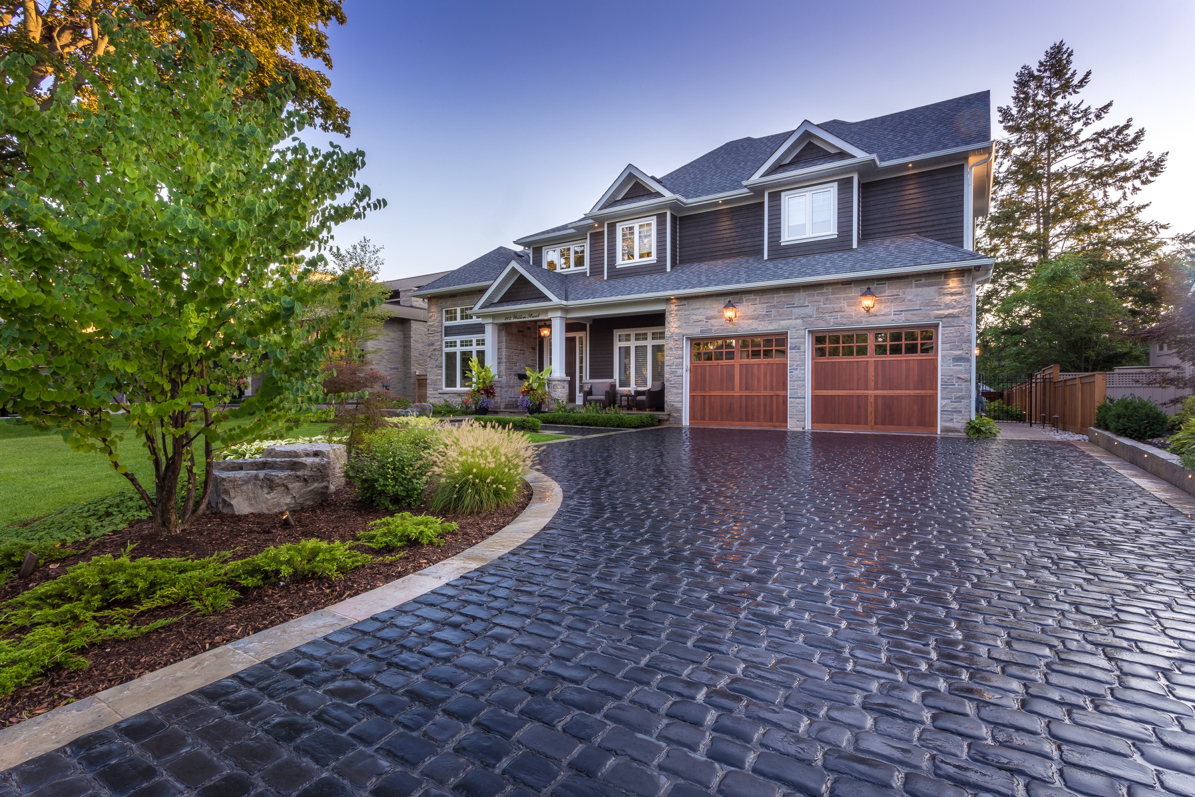 Reminiscent of the romance found in the centuries-old streets of European cities, a cobblestone driveway with an Eramosa flagstone border gives a luxurious finish to what is typically a very simple element of a landscape.