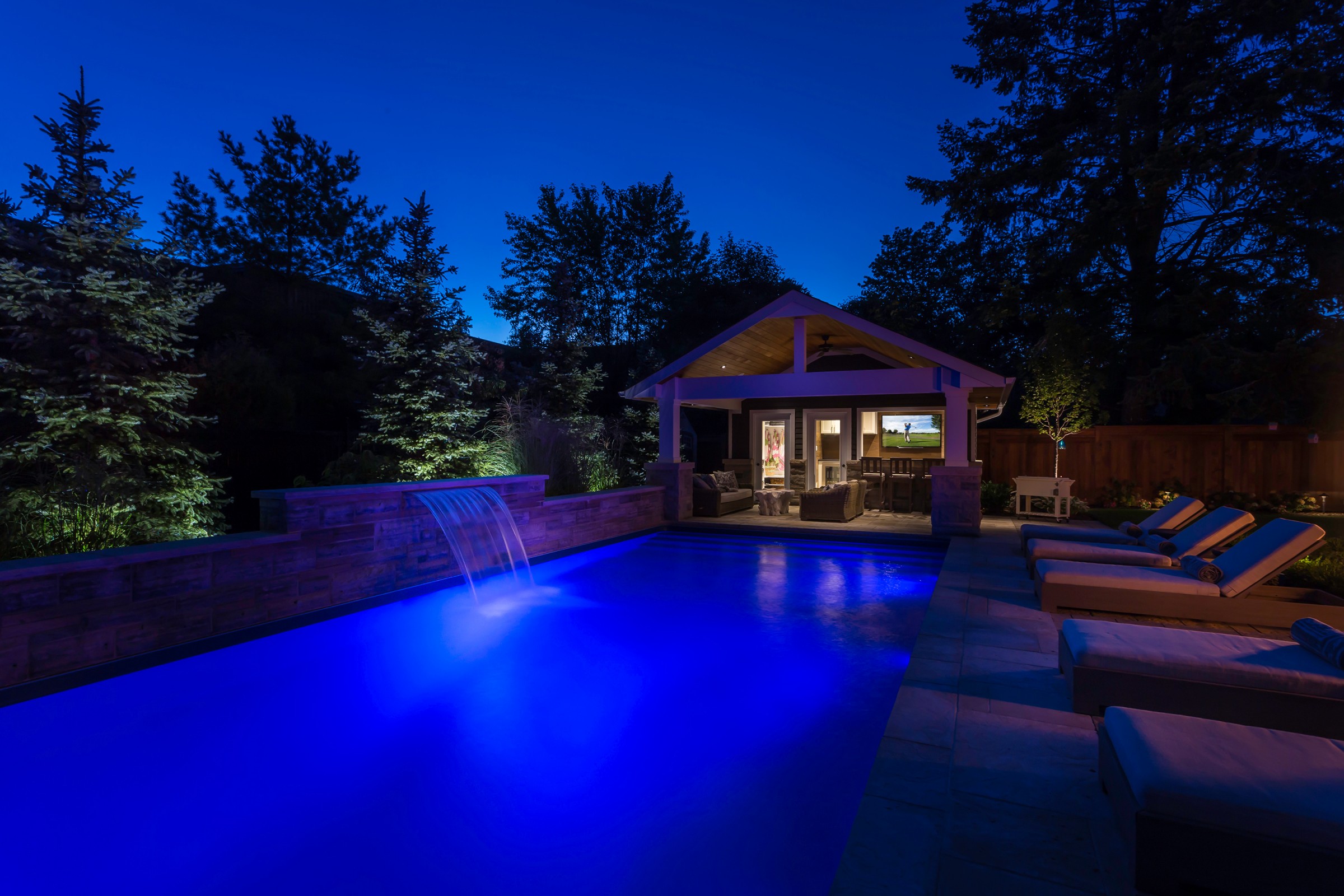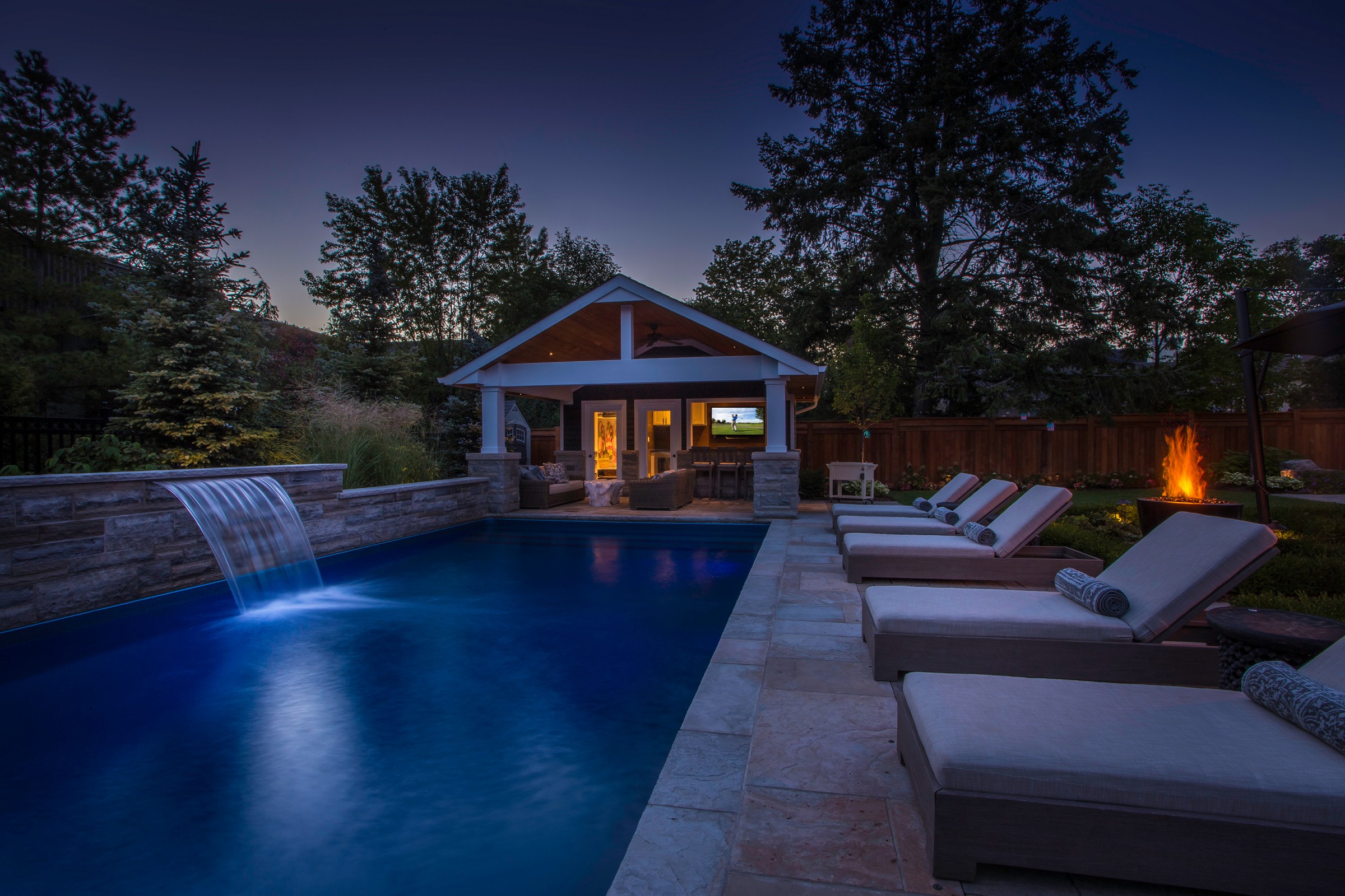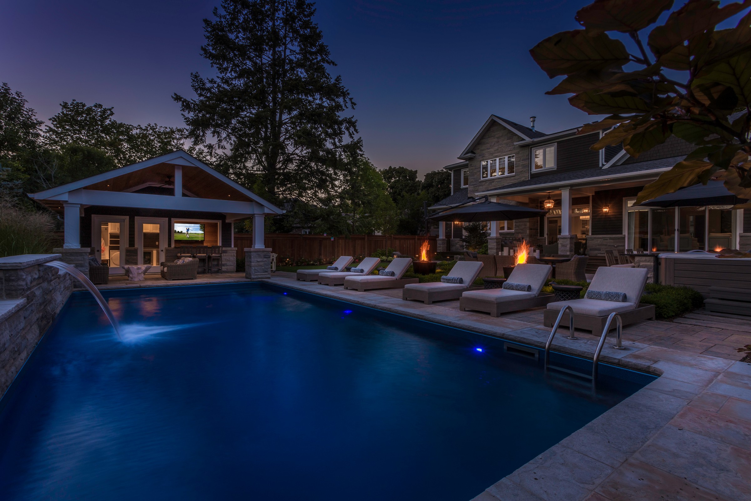 An impressive Eramosa stone wall with sheer descent waterfall anchors the formal swimming pool and the pool cabana. The hot tub is surrounded with a bar area made of the same Eramosa wall stone with a granite top that extends to a built-in grill area.