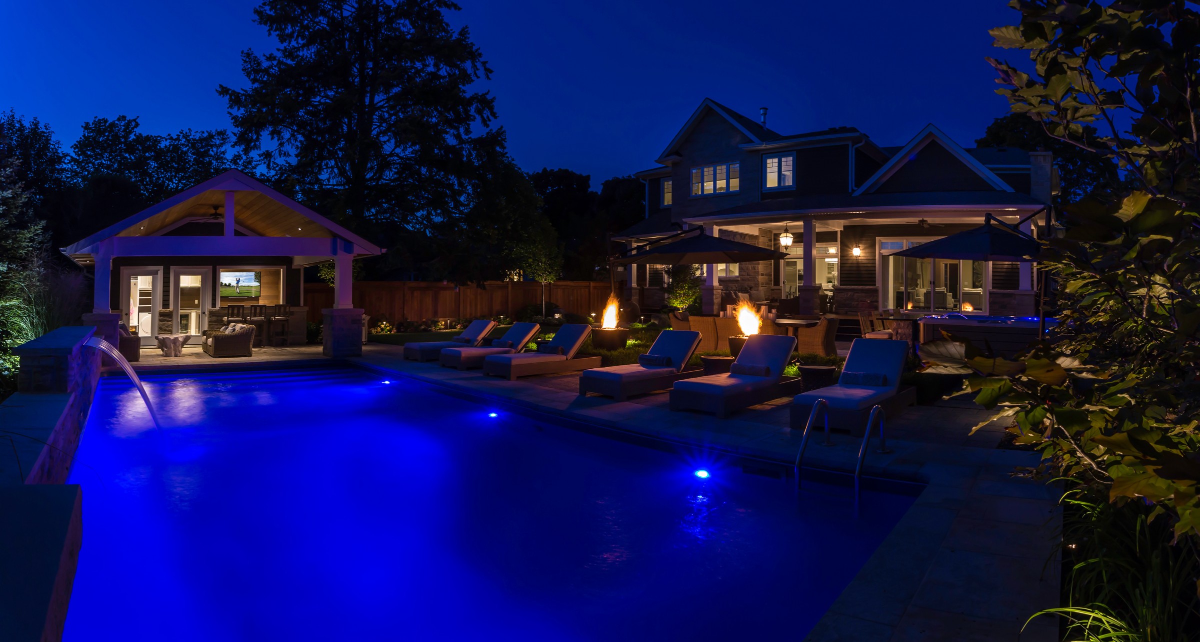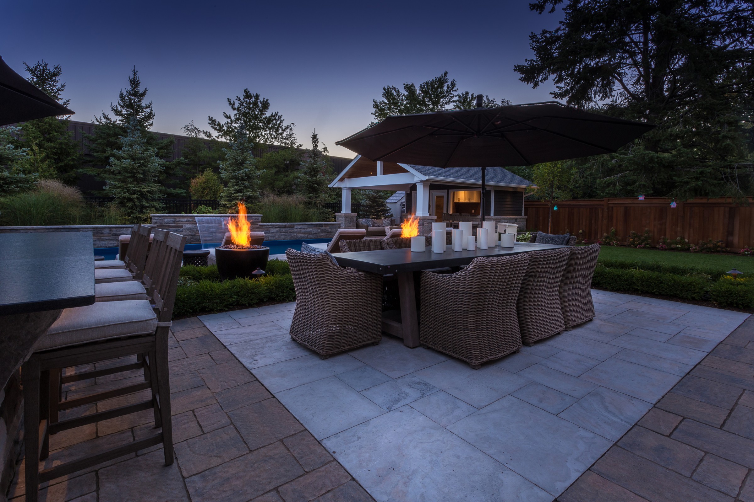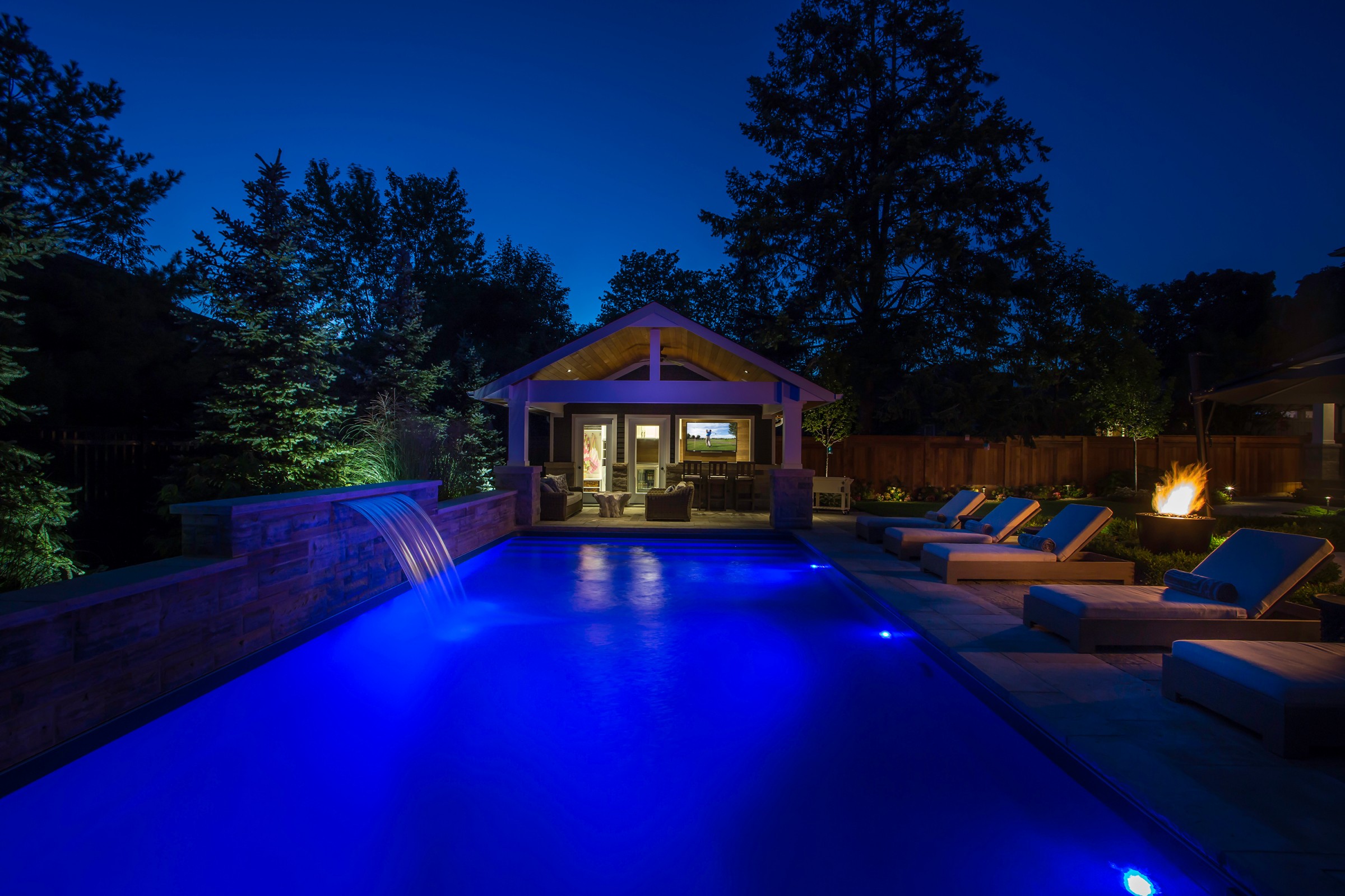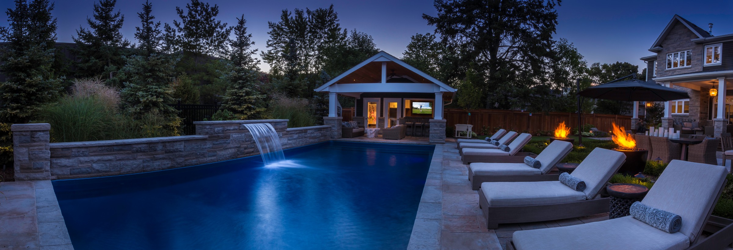 An impressive Eramosa stone wall with sheer descent waterfall anchors the formal swimming pool and the pool cabana. The hot tub is surrounded with a bar area made of the same Eramosa wall stone with a granite top that extends to a built-in grill area.