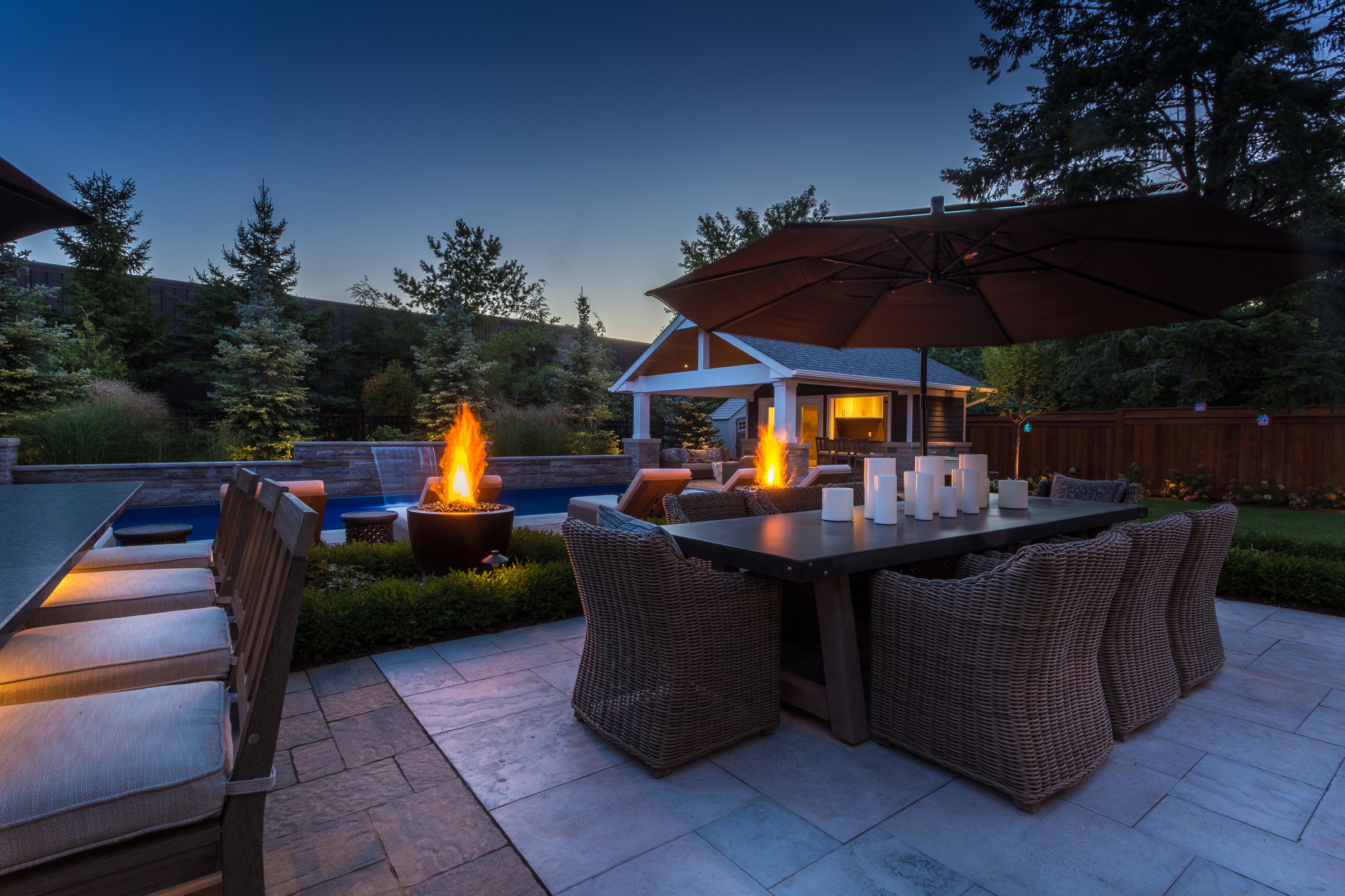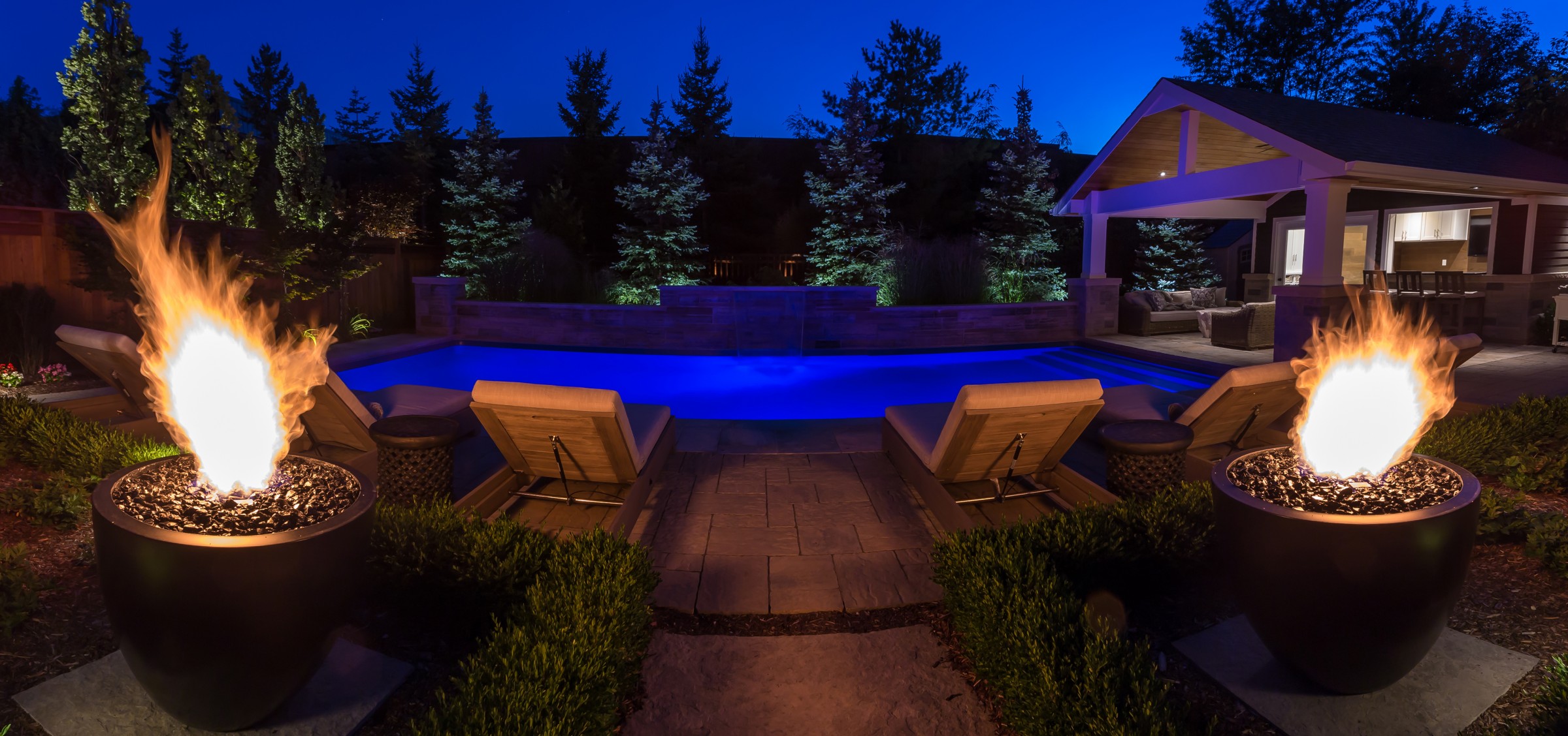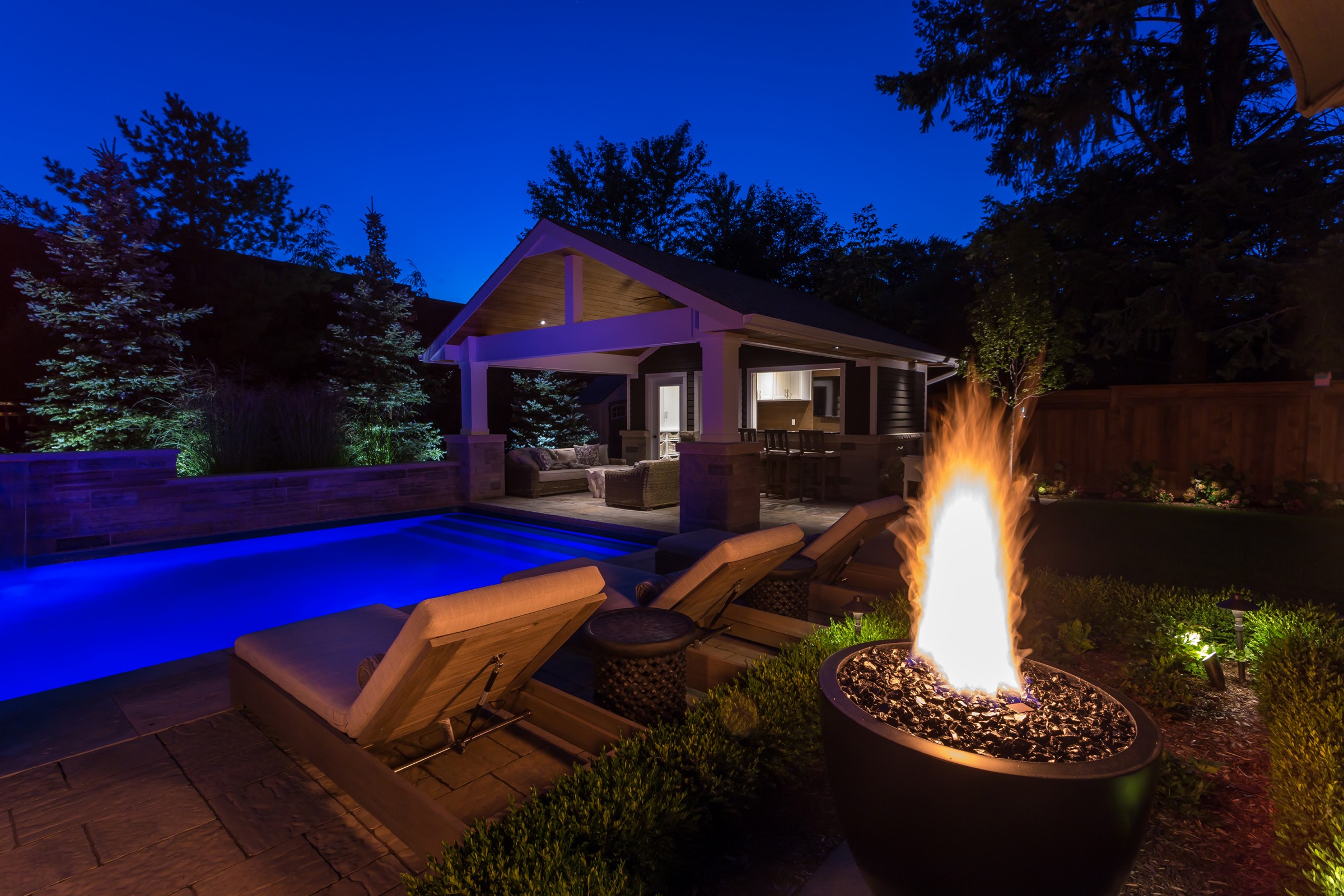 In addition to a full lighting package, the main dining patio is separated from the pool deck with a pair of fire bowls that add excitement and drama to the space, while extending the entertainment hours safely into the night.