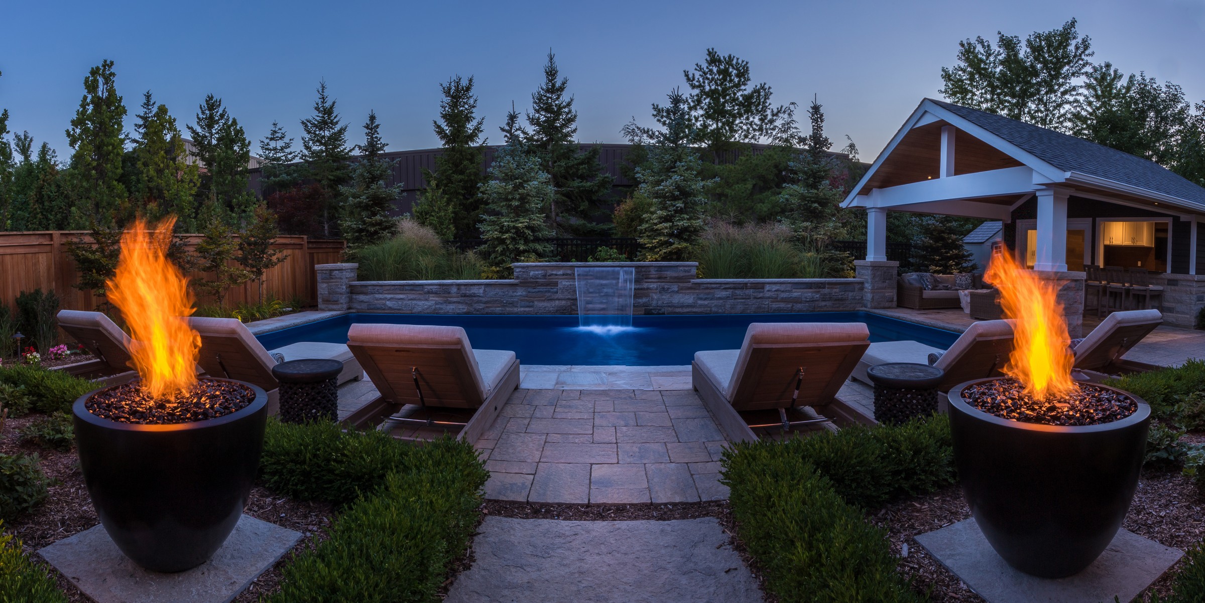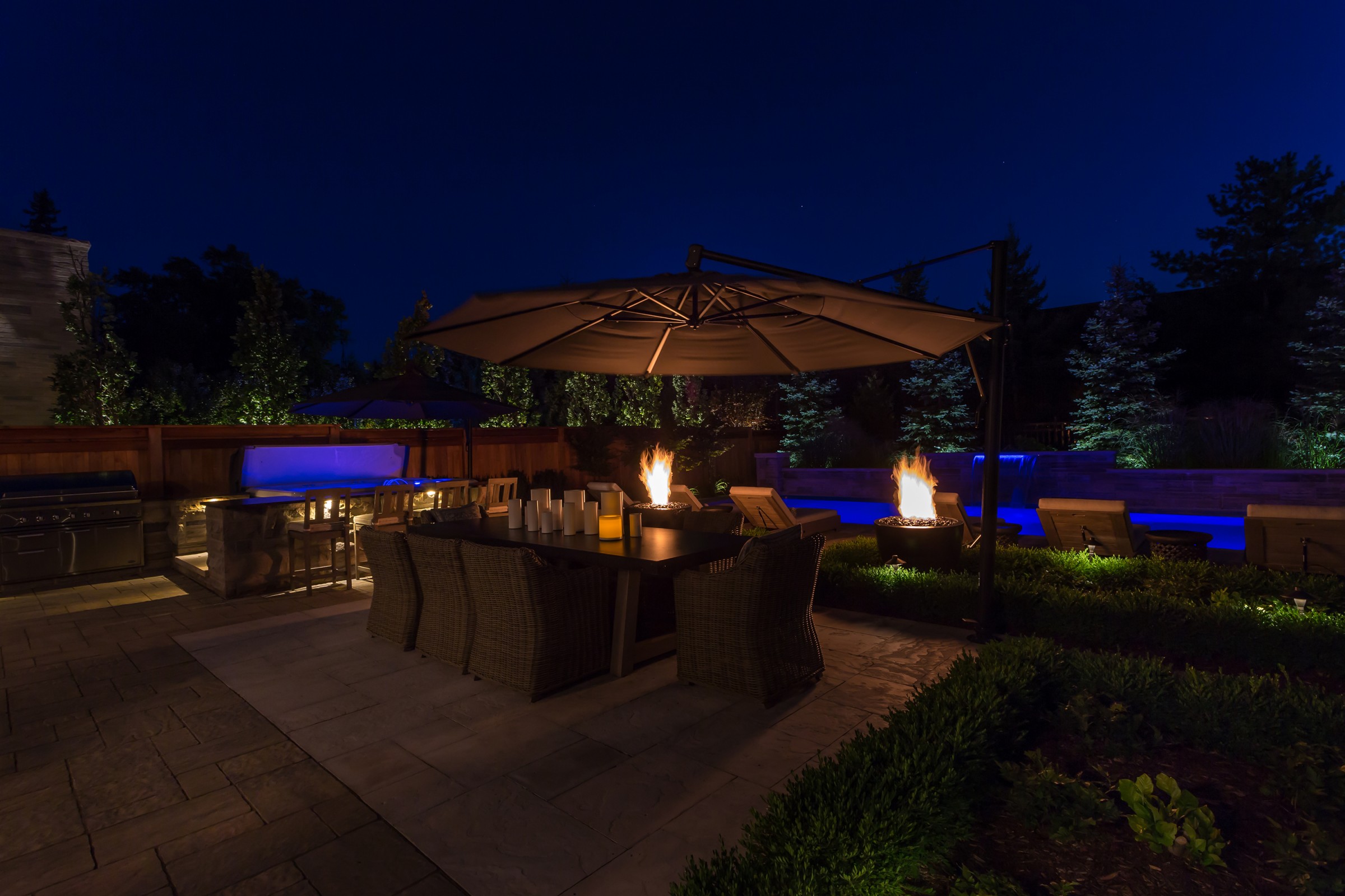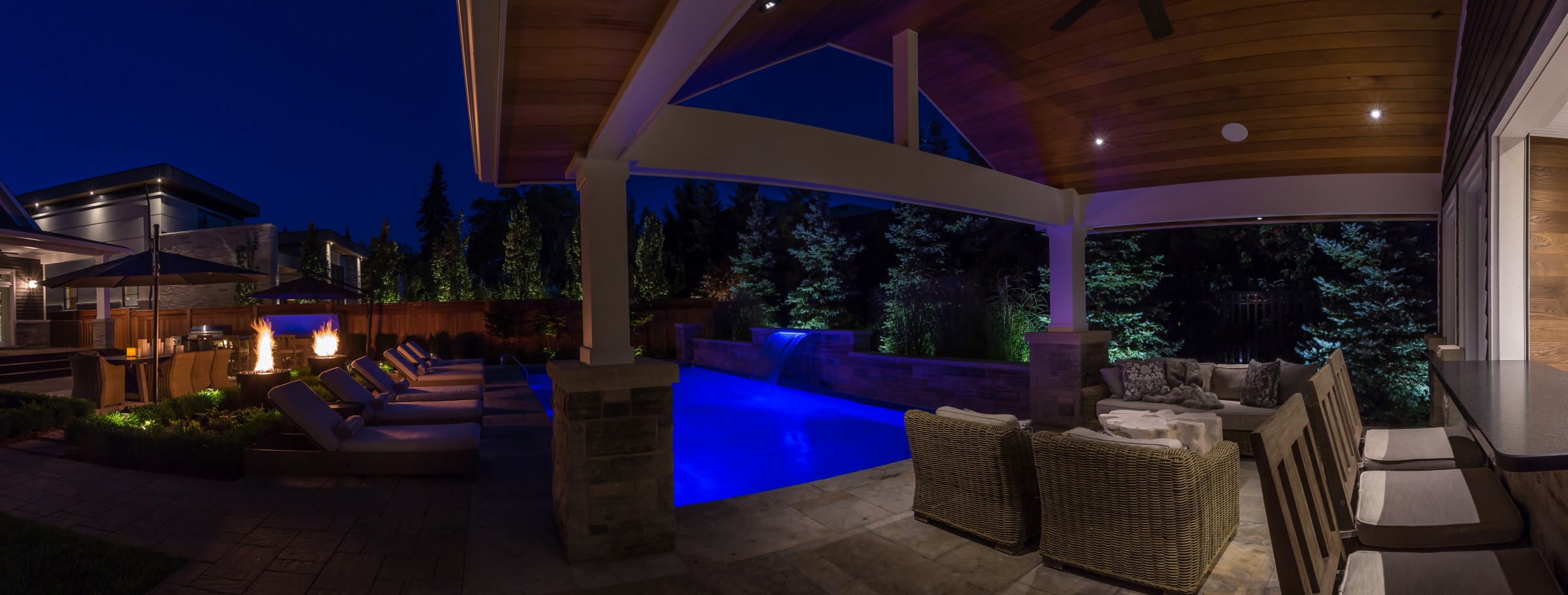 In addition to a full lighting package, the main dining patio is separated from the pool deck with a pair of fire bowls that add excitement and drama to the space, while extending the entertainment hours safely into the night.
