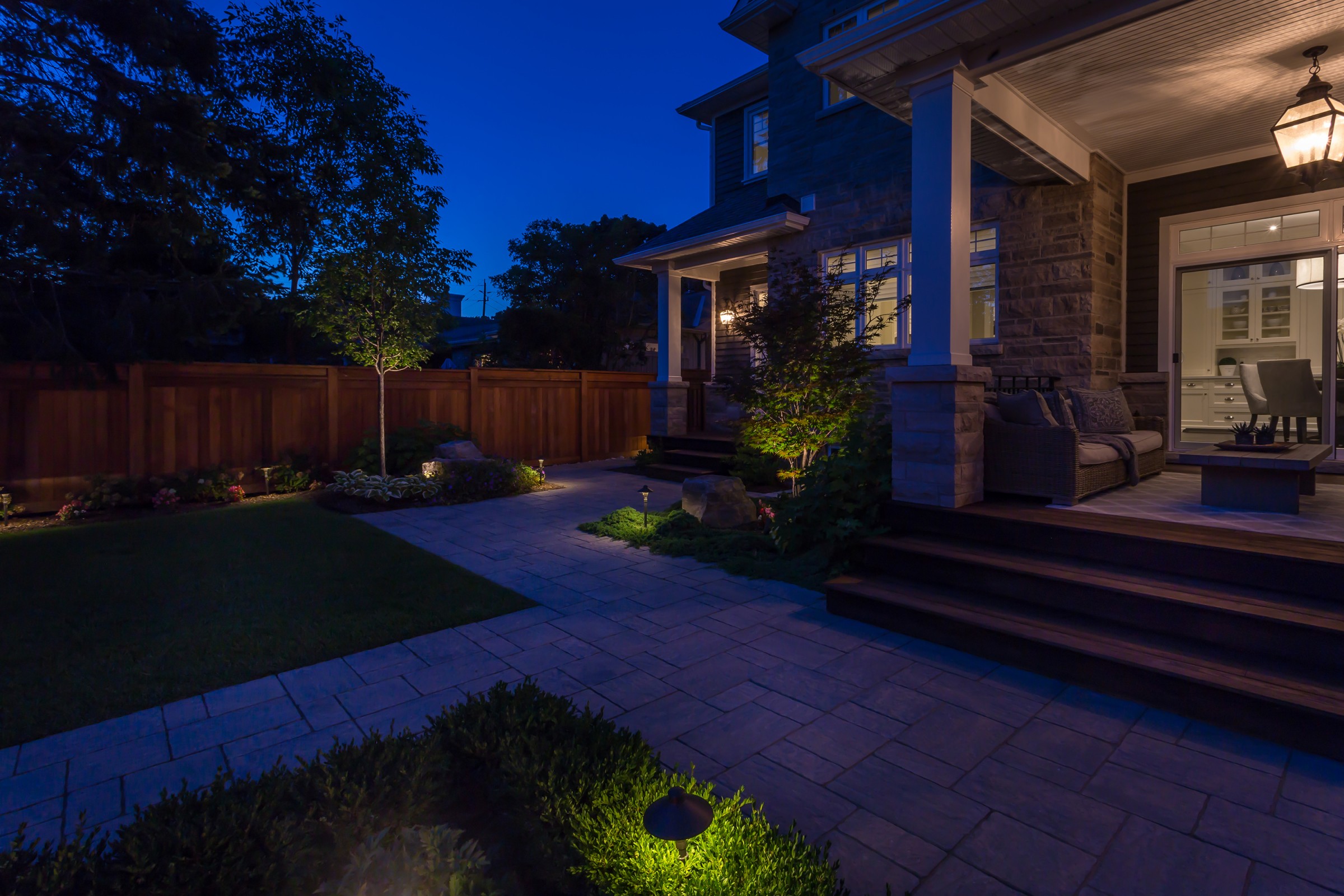 With a large building structure just beyond the back property line, screening and focusing attention within the property — while still allowing the landscape to breath and feel natural — was a high priority.