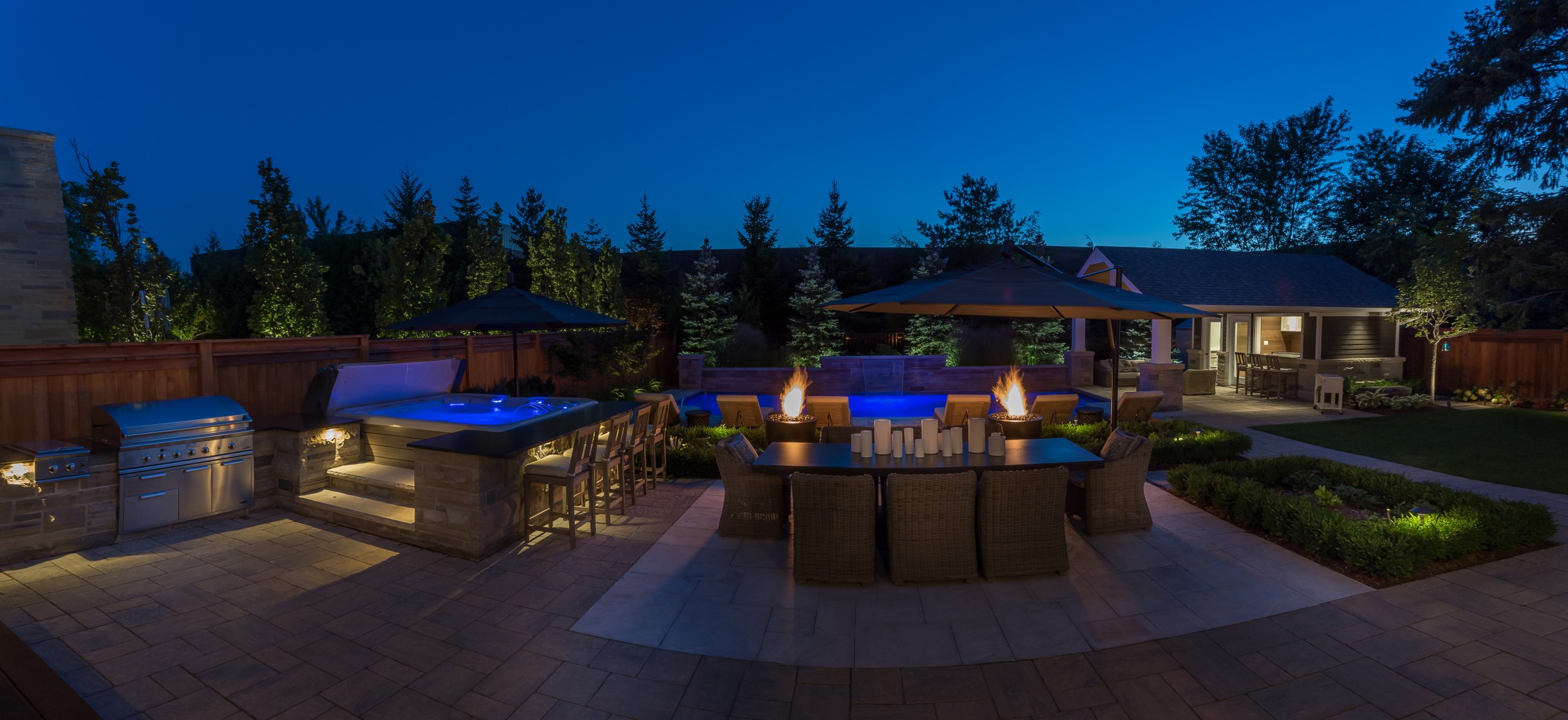 Whether lounging in the sun, dining in the open air, soaking in the simple pleasure of a swim in the hot tub or pool, or enjoying a drink with friends and family under the poolside cabana’s covered seating area — the possibilities in this landscape really are endless.