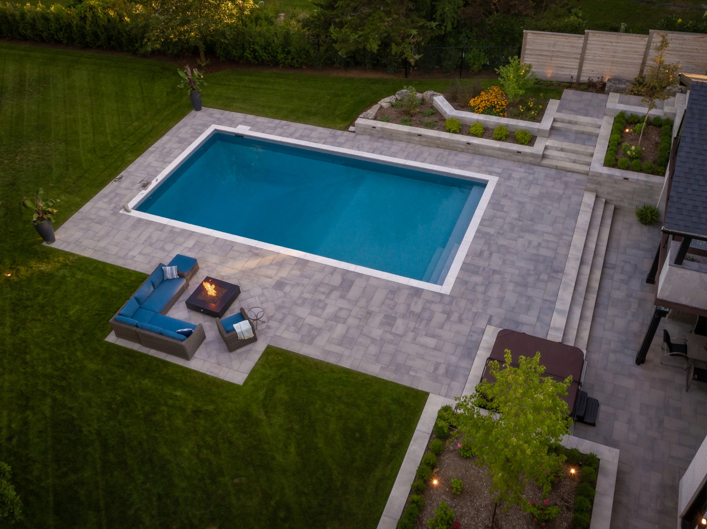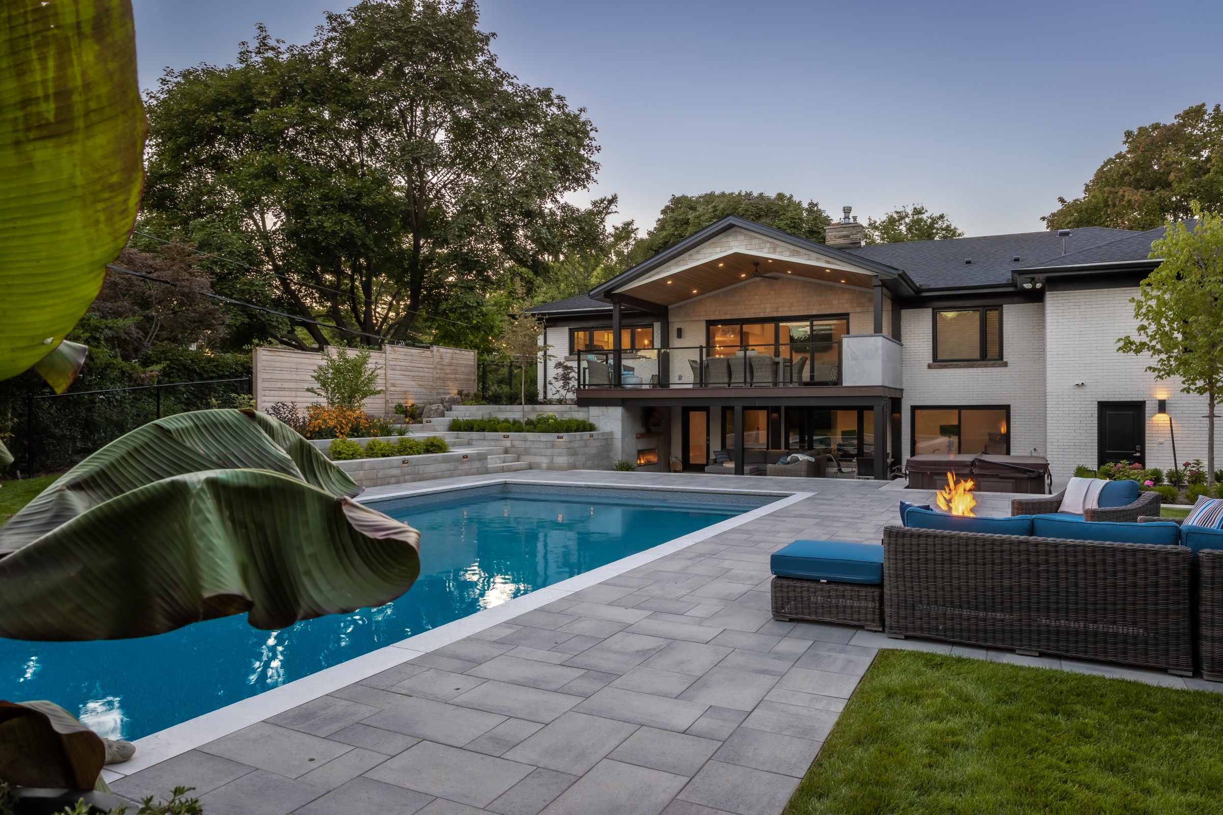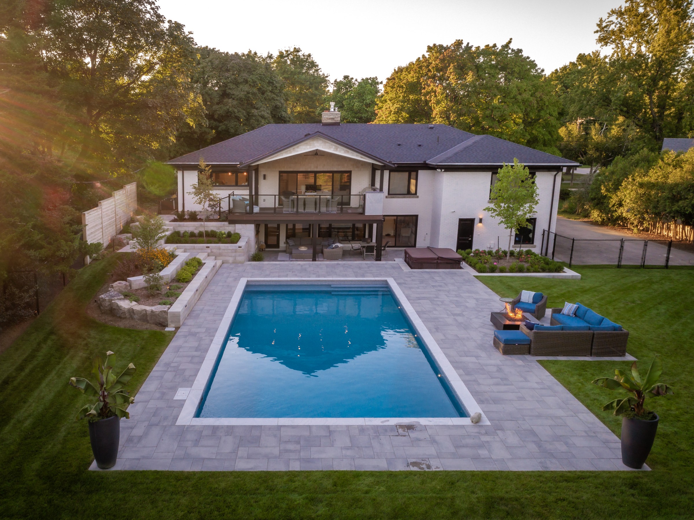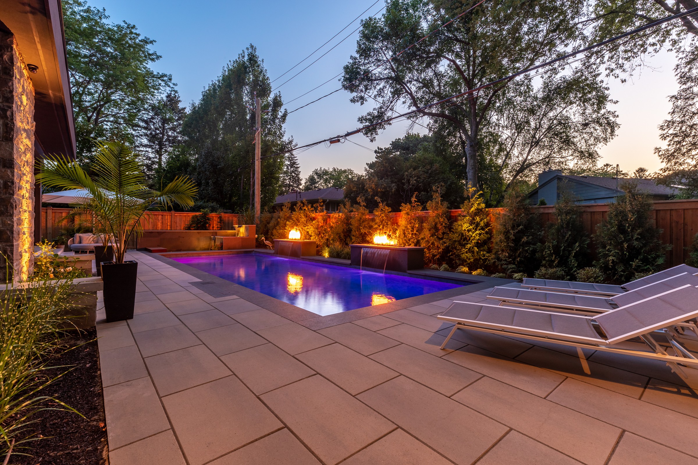 This modern escape blends fire and water in perfect harmony. Twin waterfall-fire features frame the in-ground pool, while a two-tiered fountain and sleek stonework walkway set a tranquil, contemporary atmosphere. A sanctuary designed for balance and beauty.