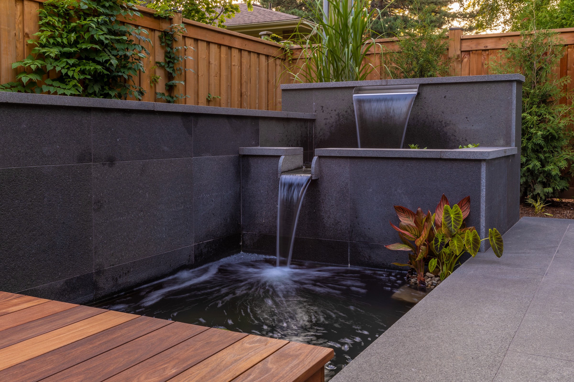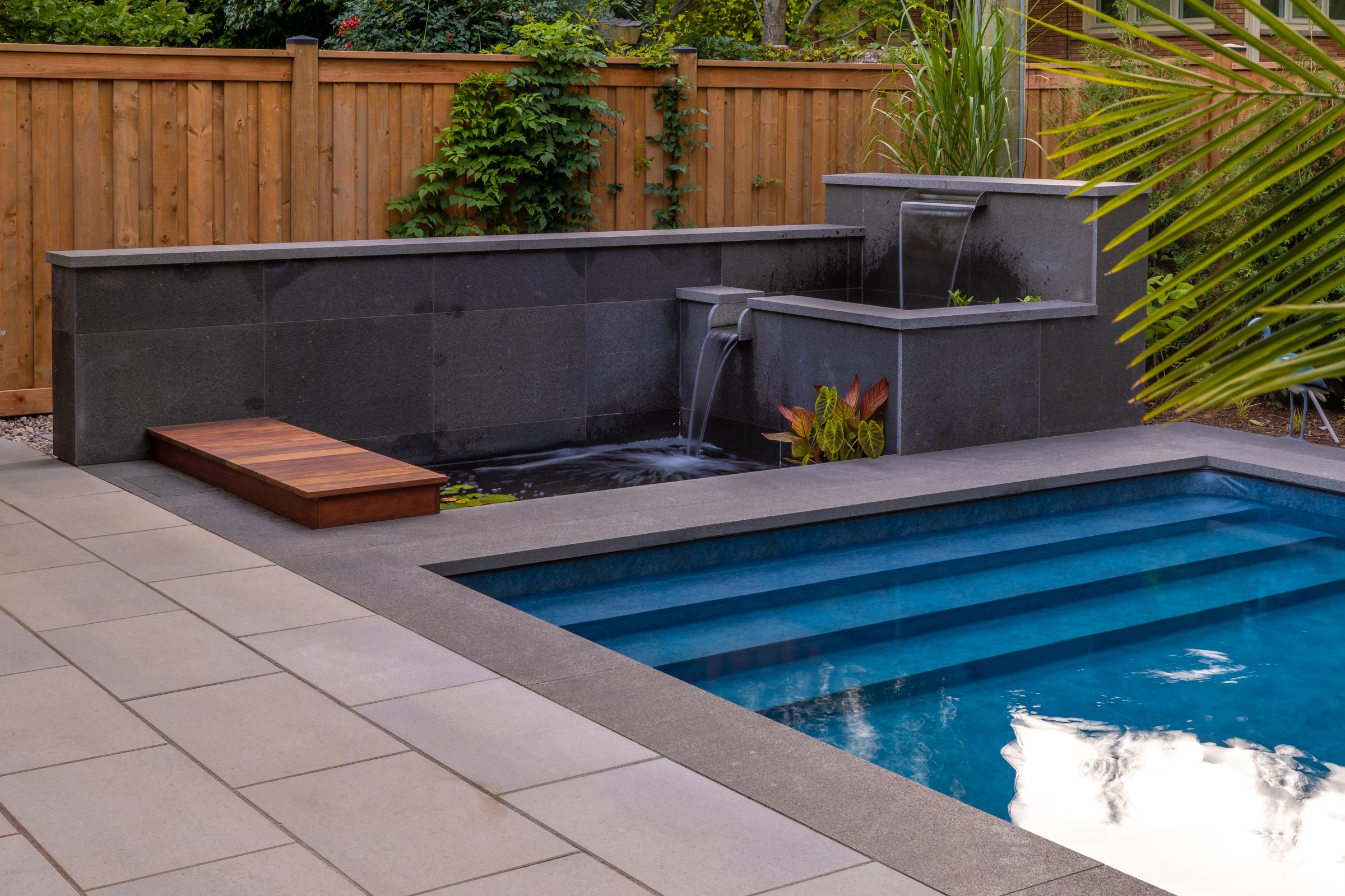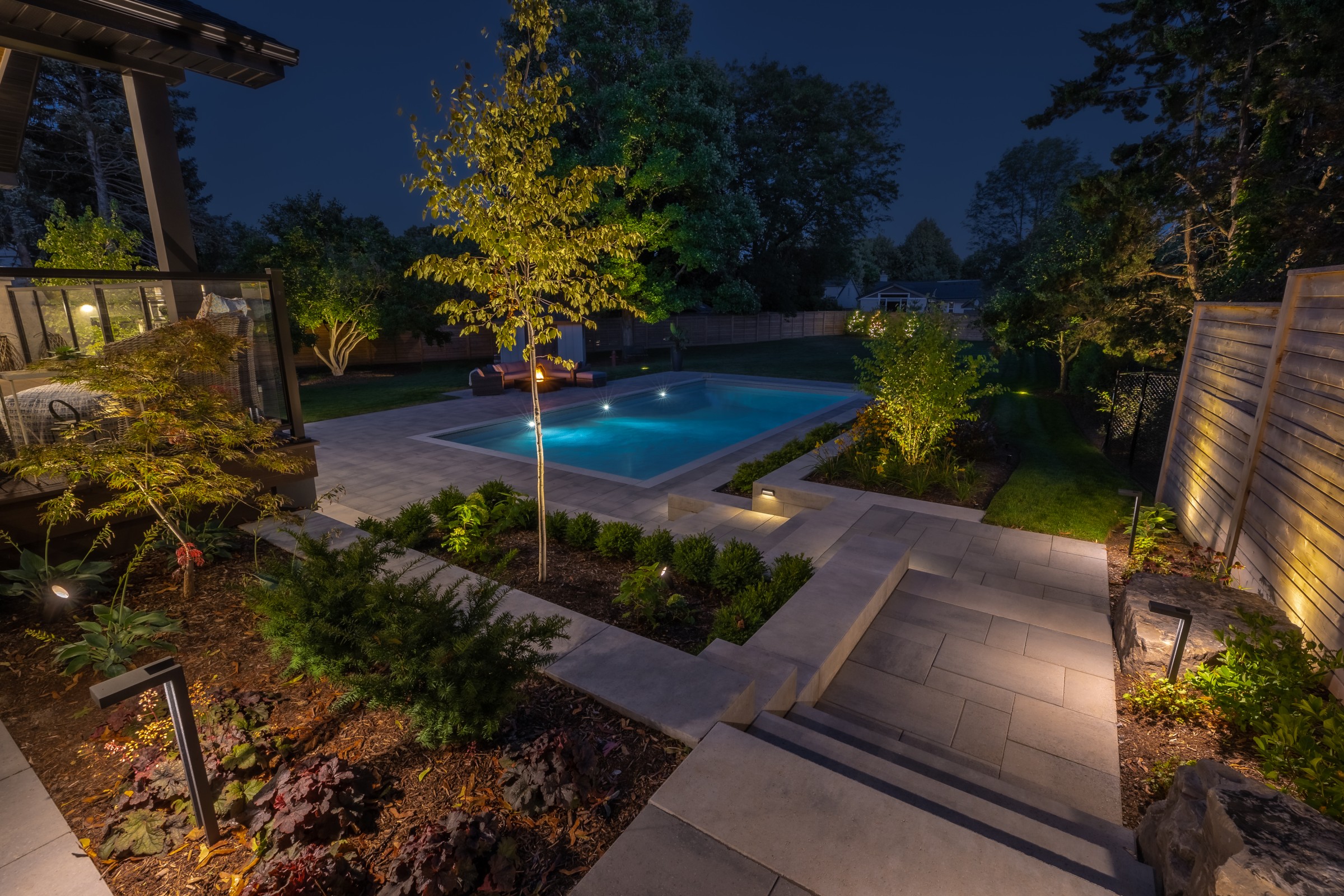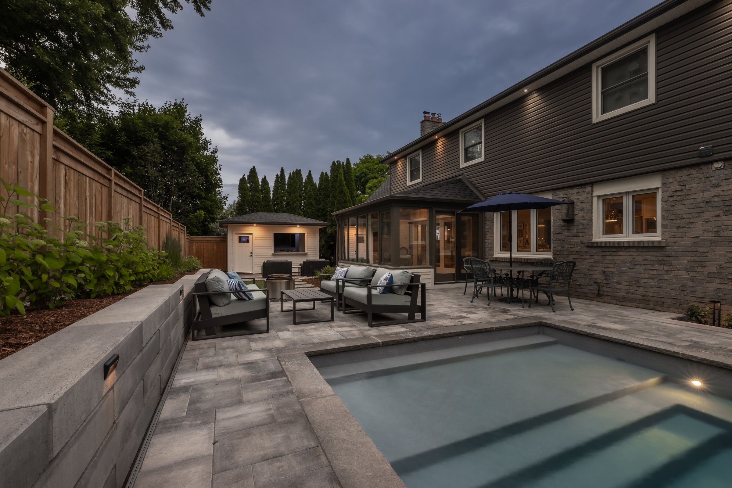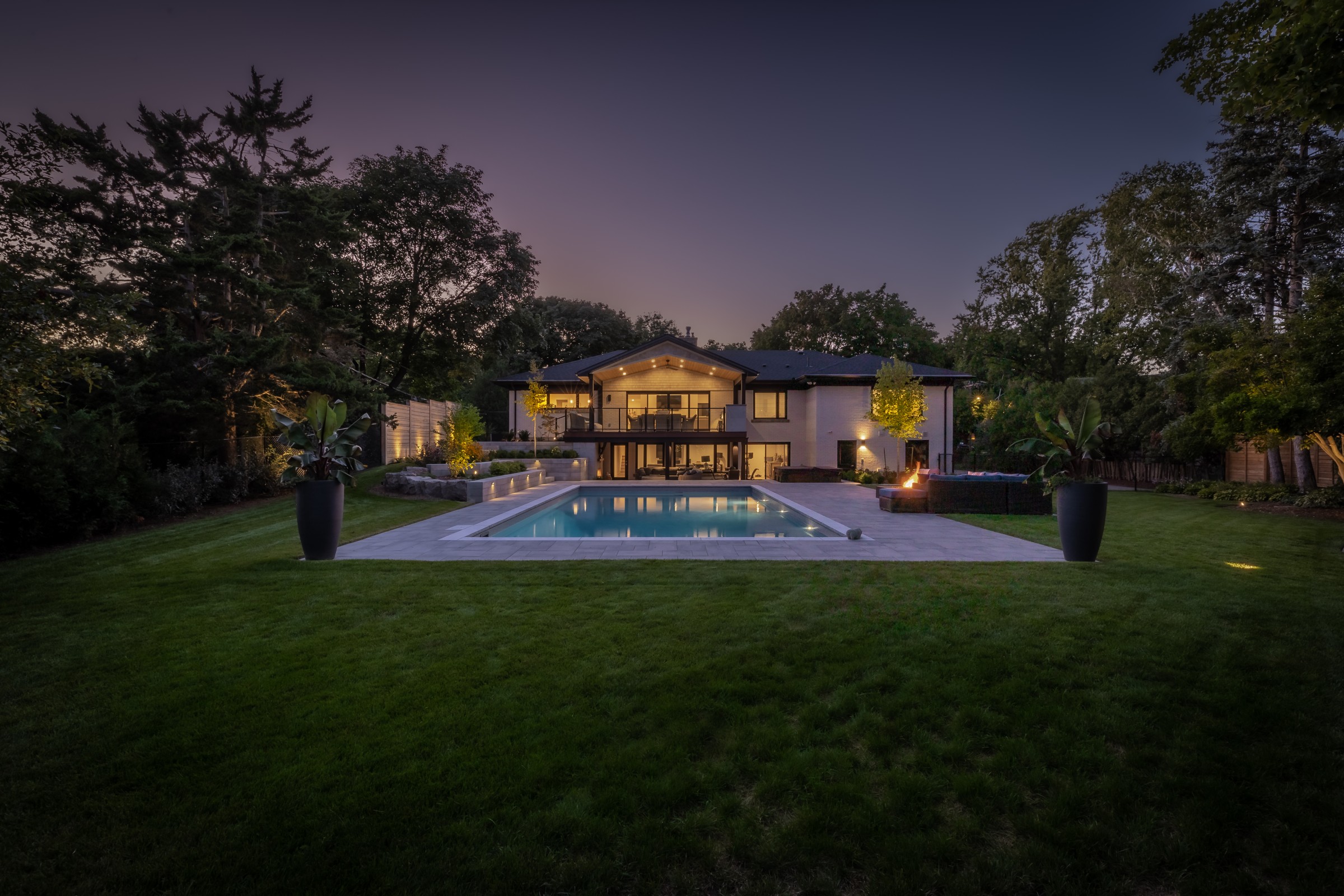 This modern escape blends fire and water in perfect harmony. Twin waterfall-fire features frame the in-ground pool, while a two-tiered fountain and sleek stonework walkway set a tranquil, contemporary atmosphere. A sanctuary designed for balance and beauty.