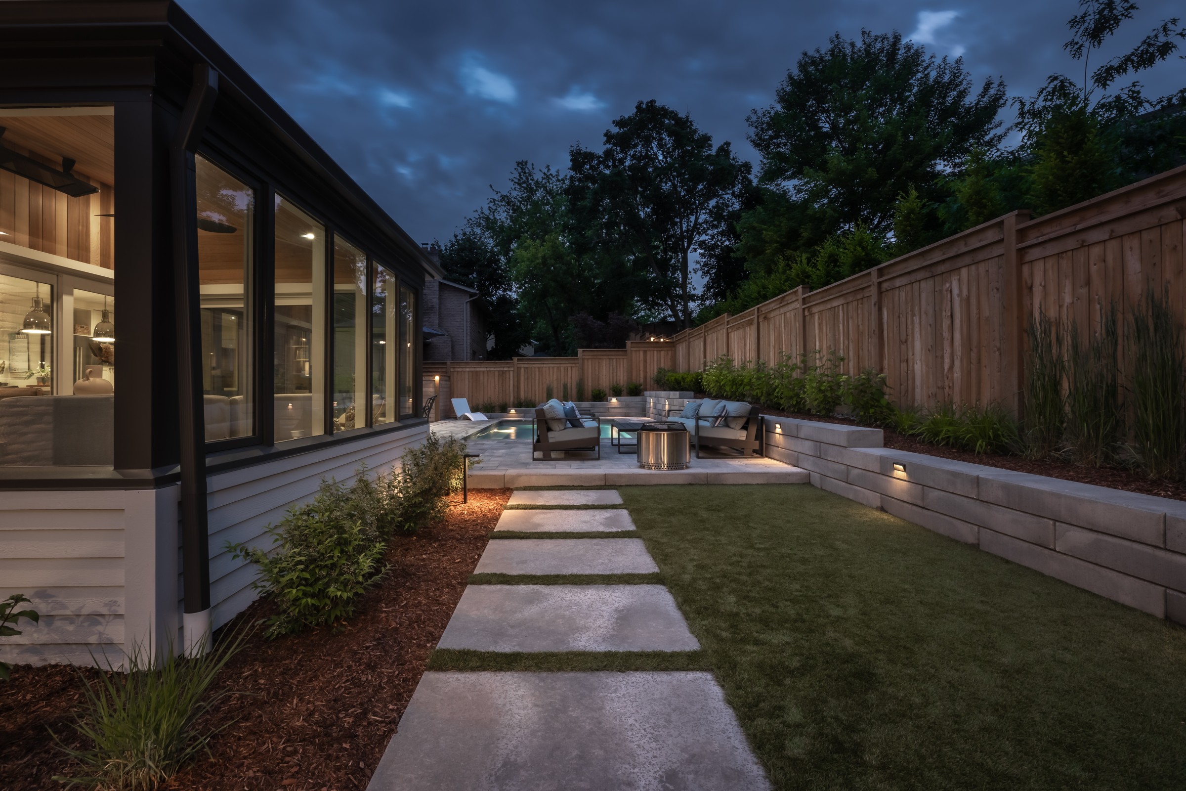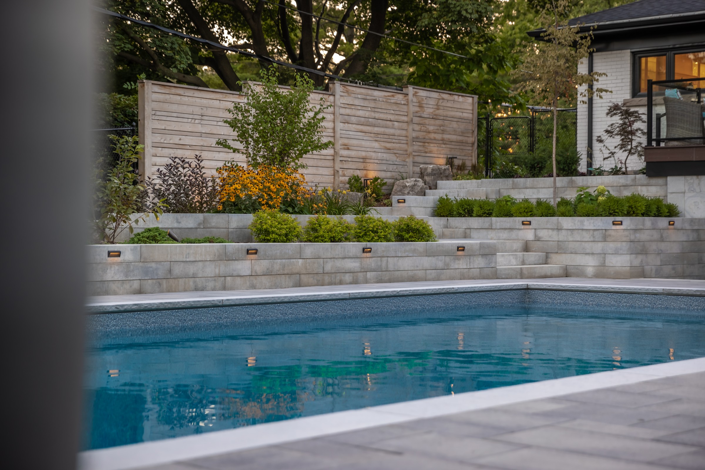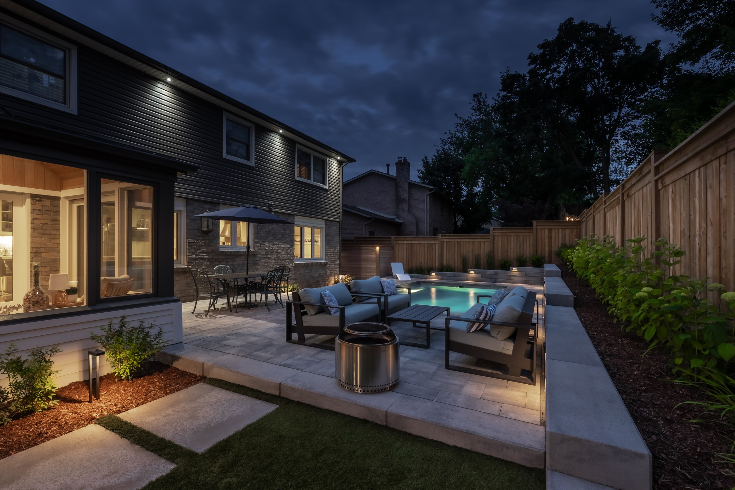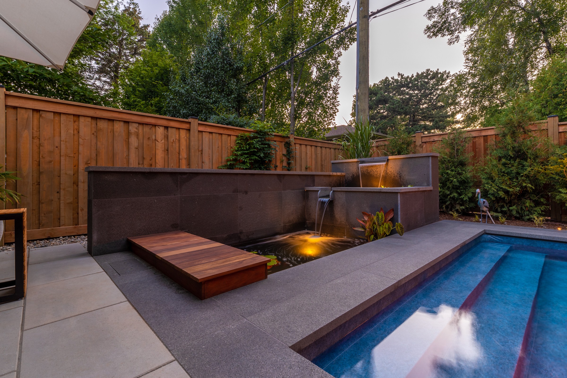 This modern escape blends fire and water in perfect harmony. Twin waterfall-fire features frame the in-ground pool, while a two-tiered fountain and sleek stonework walkway set a tranquil, contemporary atmosphere. A sanctuary designed for balance and beauty.