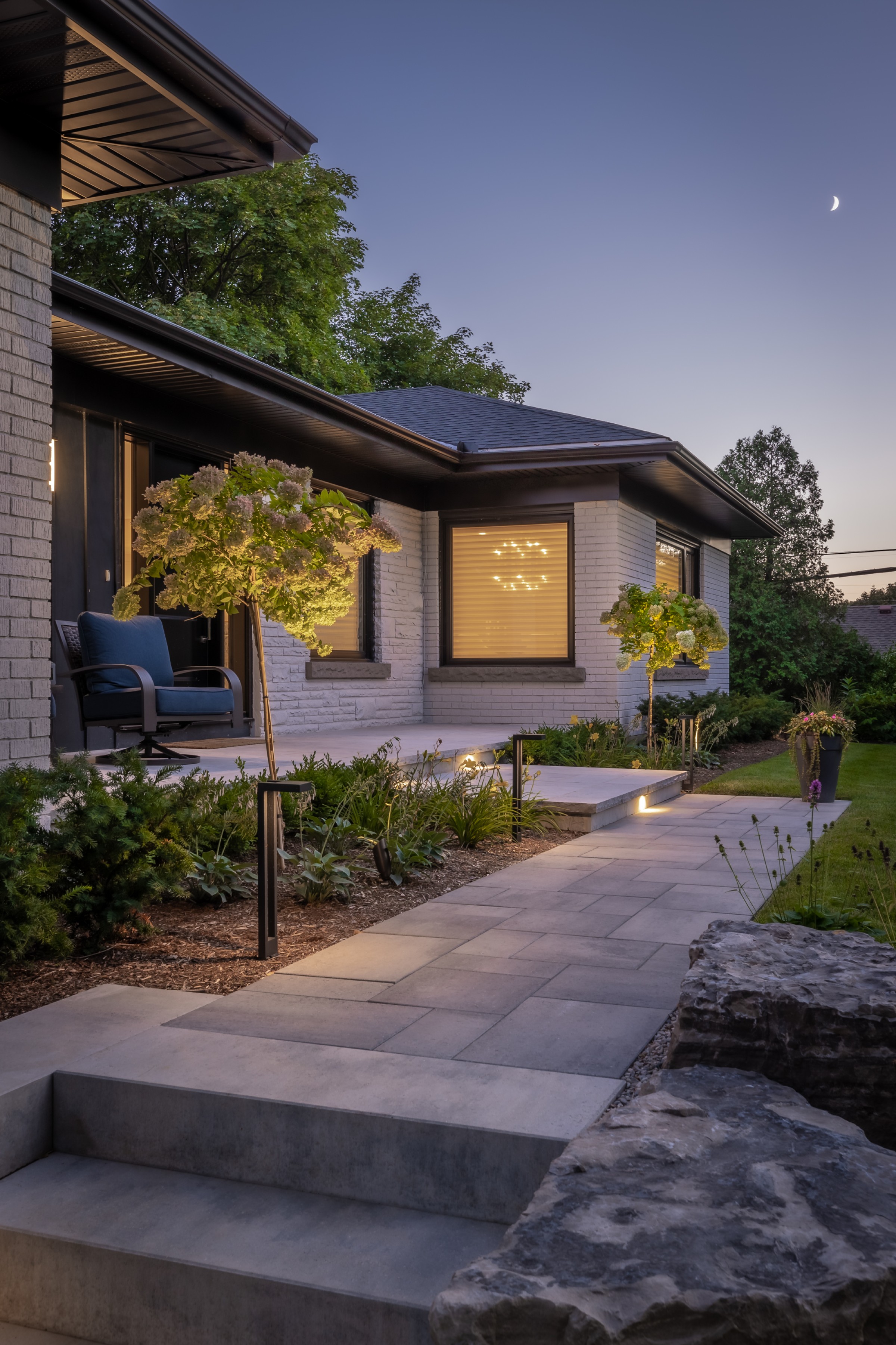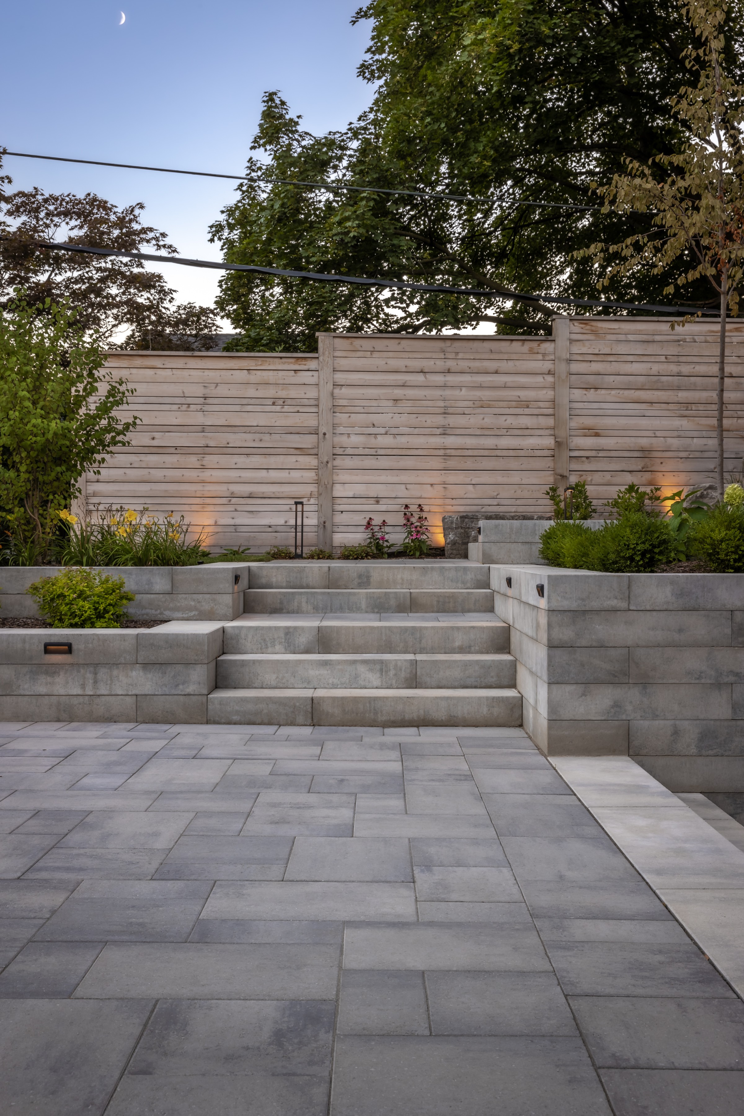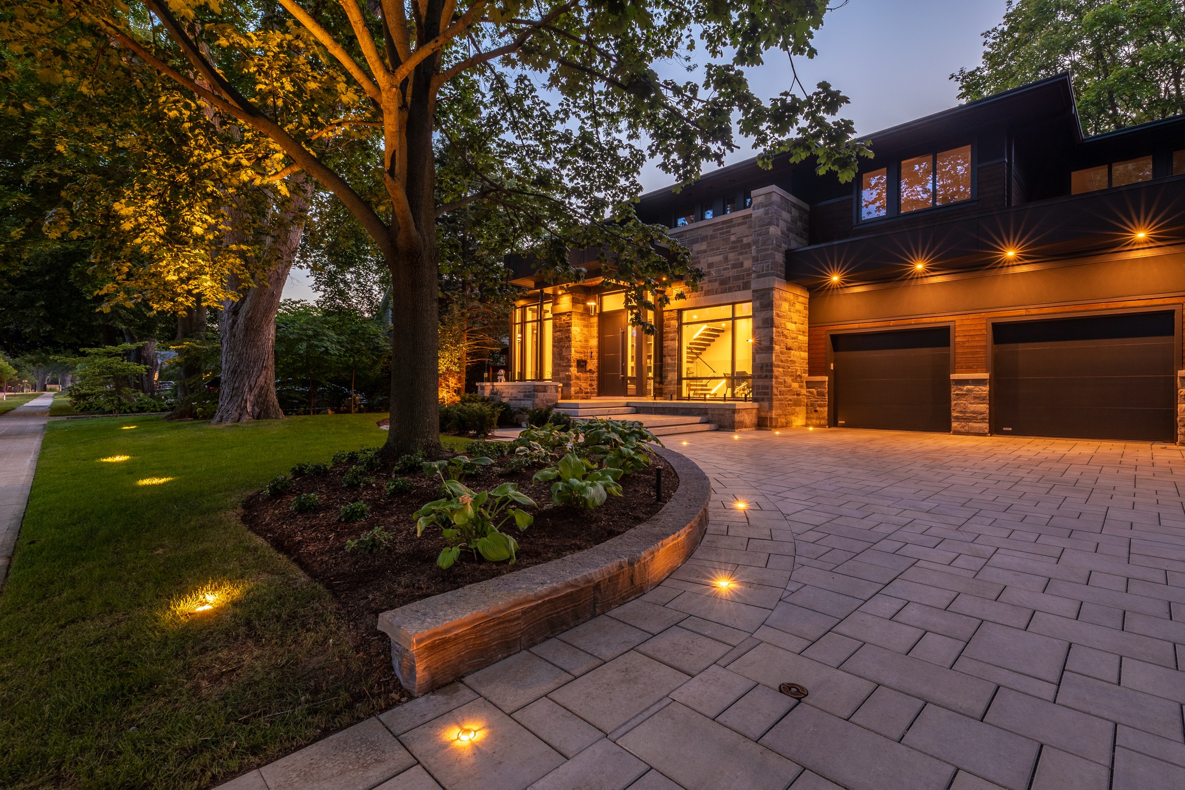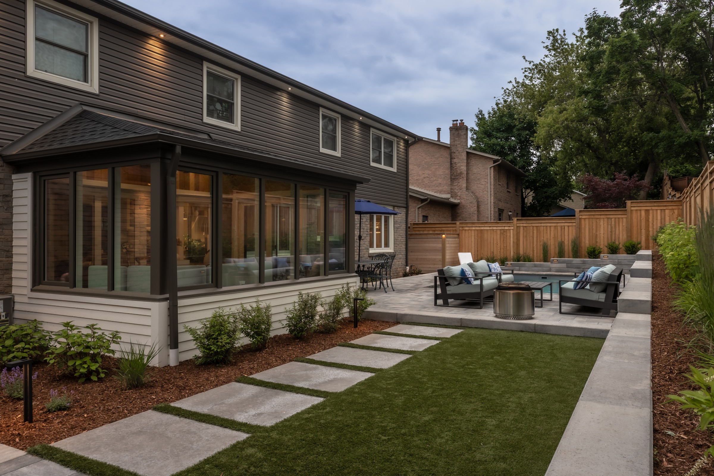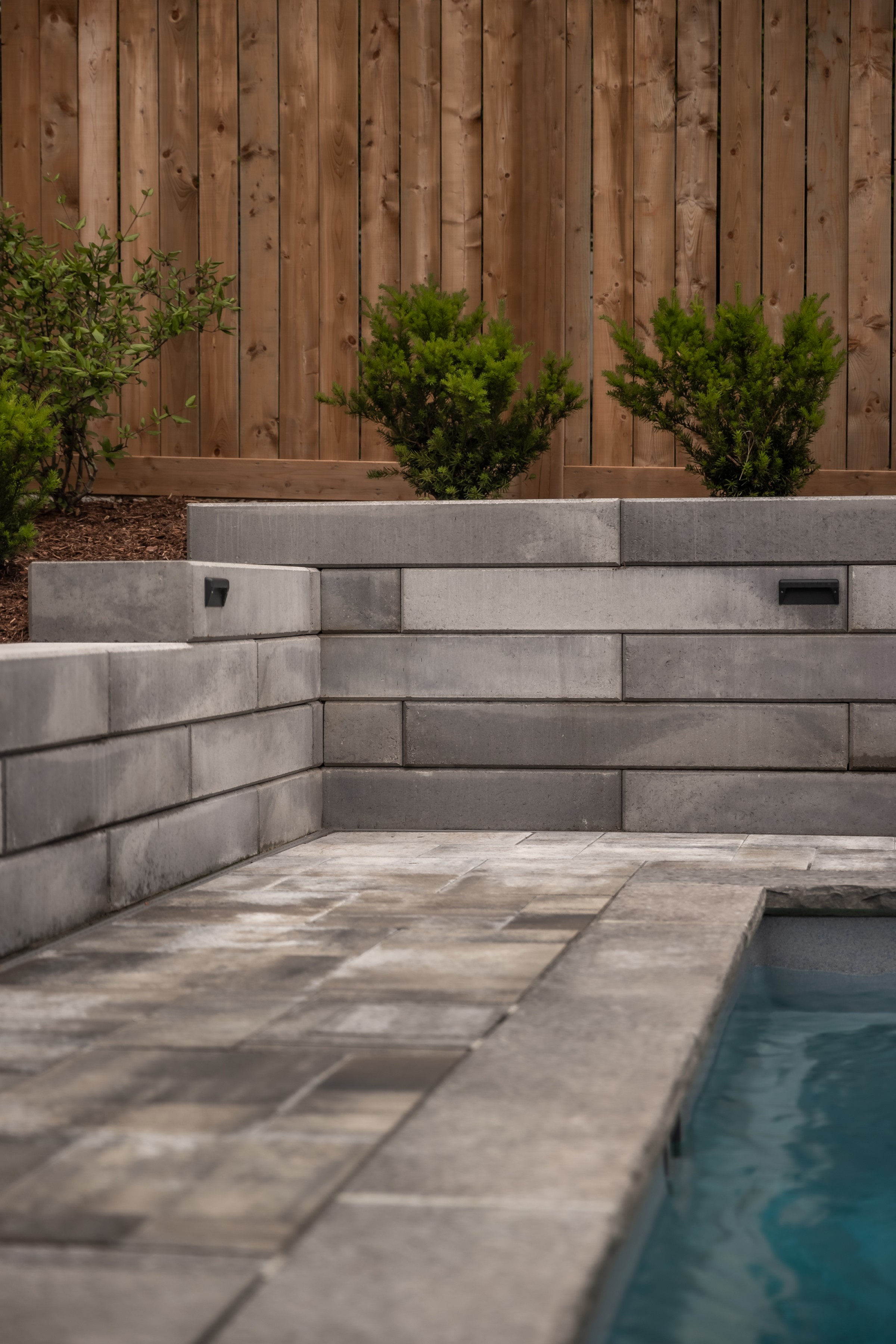 This modern escape blends fire and water in perfect harmony. Twin waterfall-fire features frame the in-ground pool, while a two-tiered fountain and sleek stonework walkway set a tranquil, contemporary atmosphere. A sanctuary designed for balance and beauty.