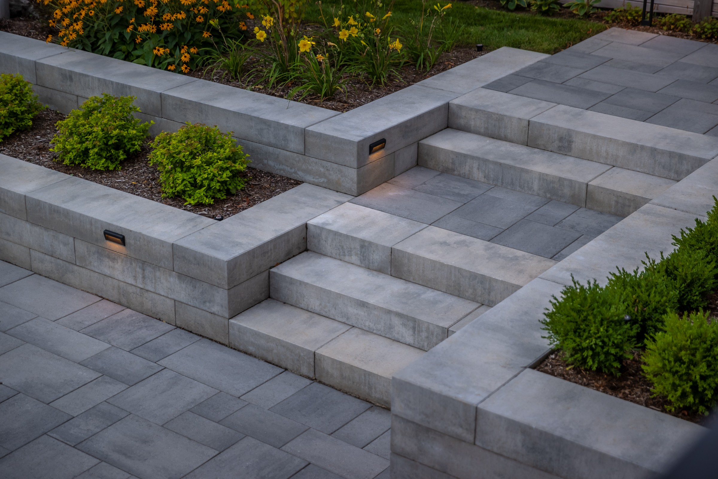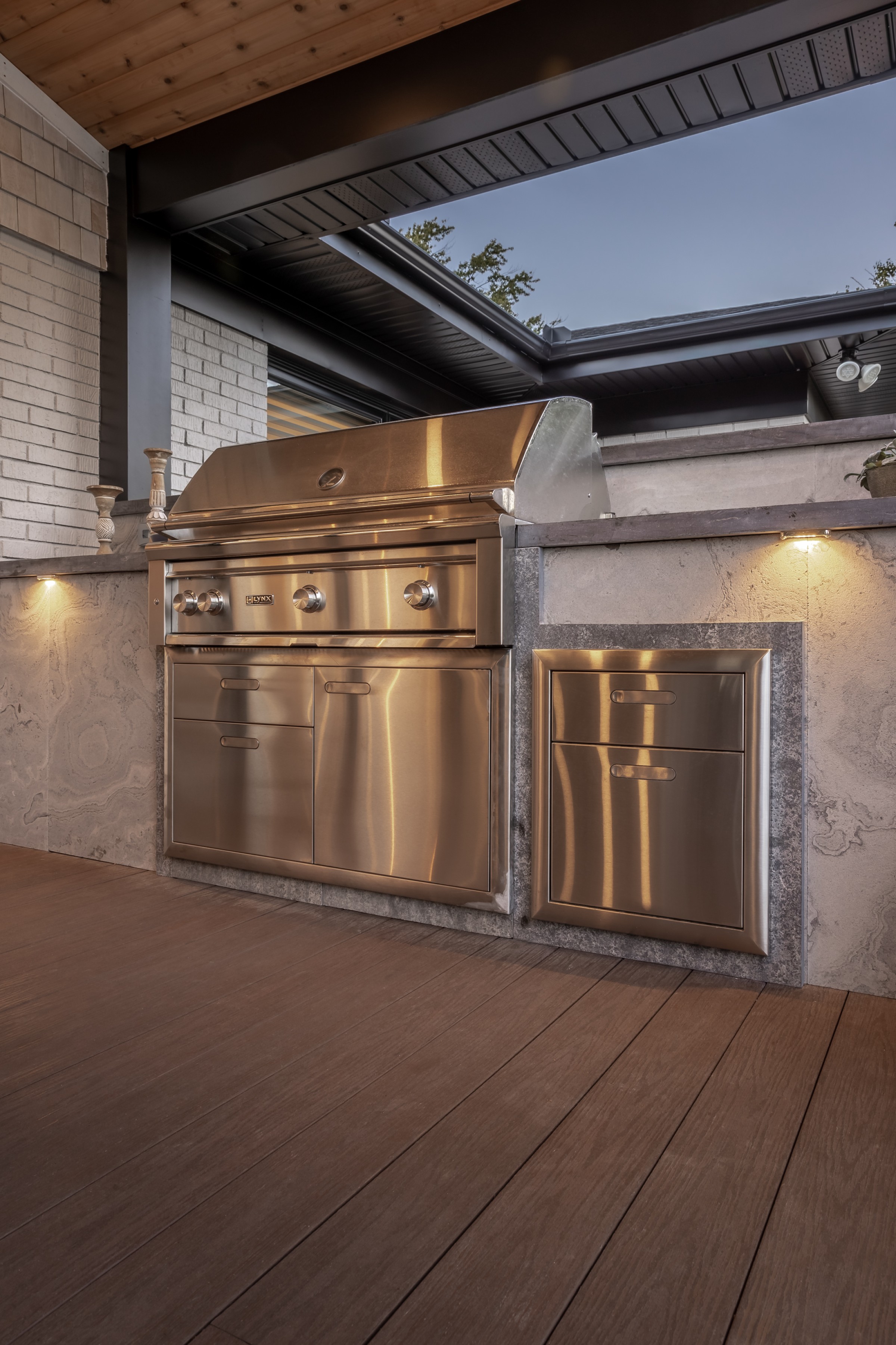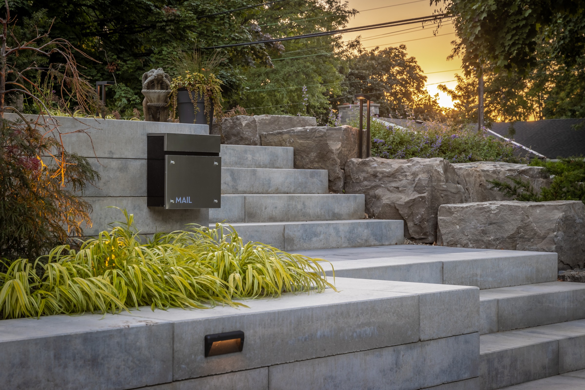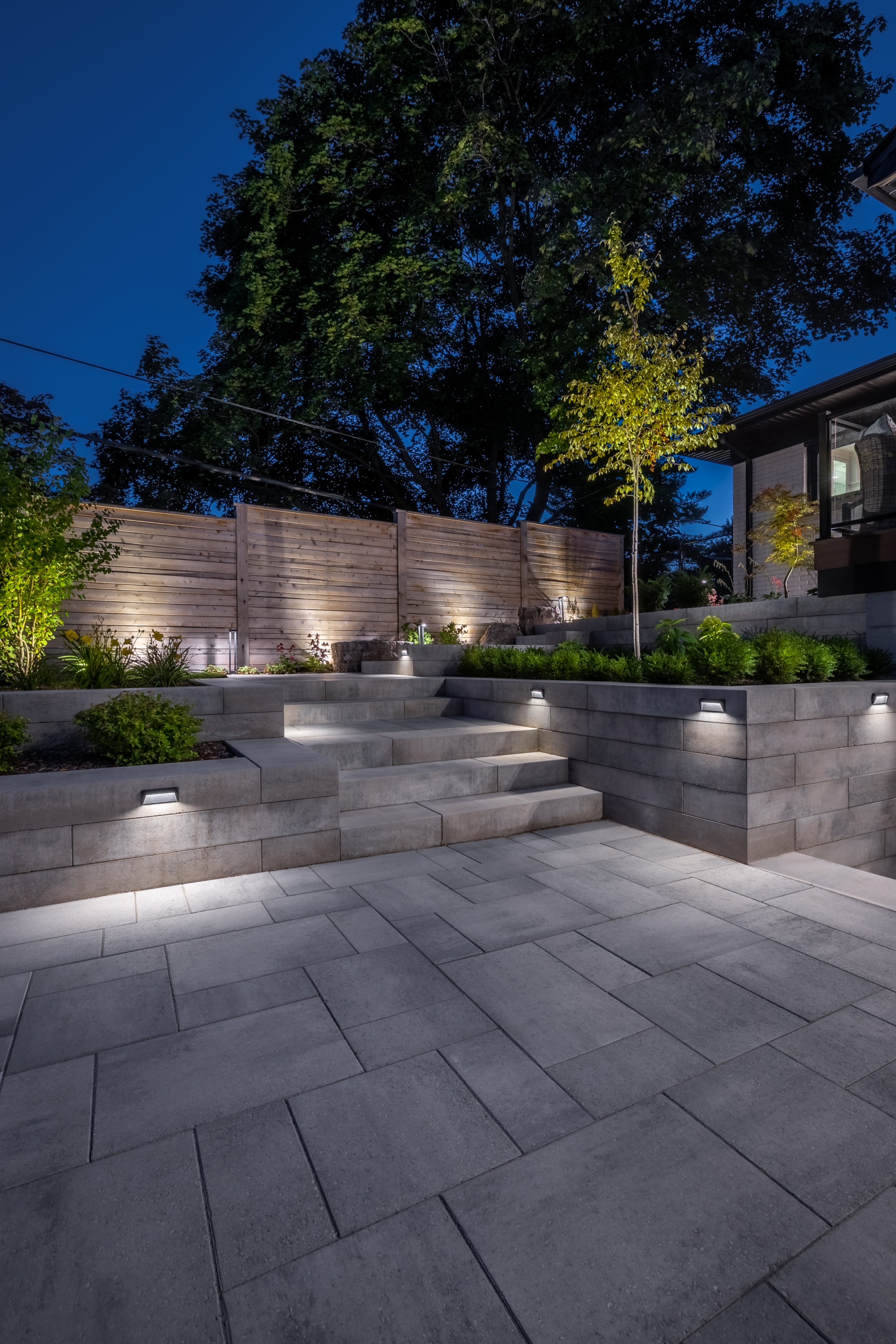 This modern escape blends fire and water in perfect harmony. Twin waterfall-fire features frame the in-ground pool, while a two-tiered fountain and sleek stonework walkway set a tranquil, contemporary atmosphere. A sanctuary designed for balance and beauty.