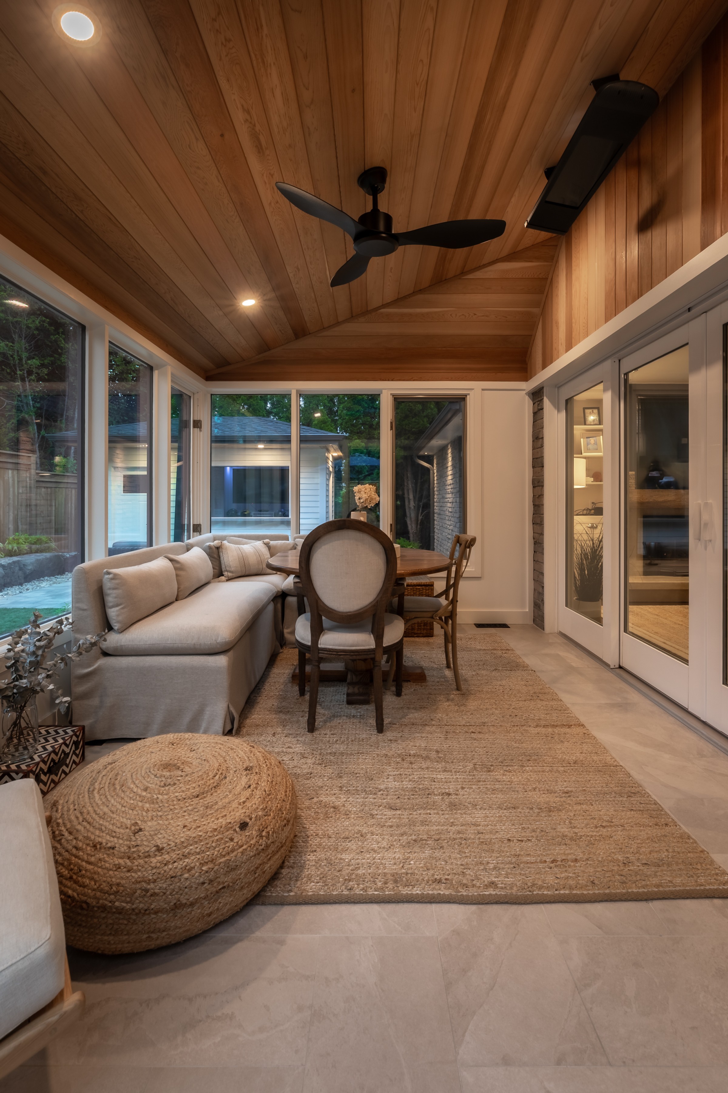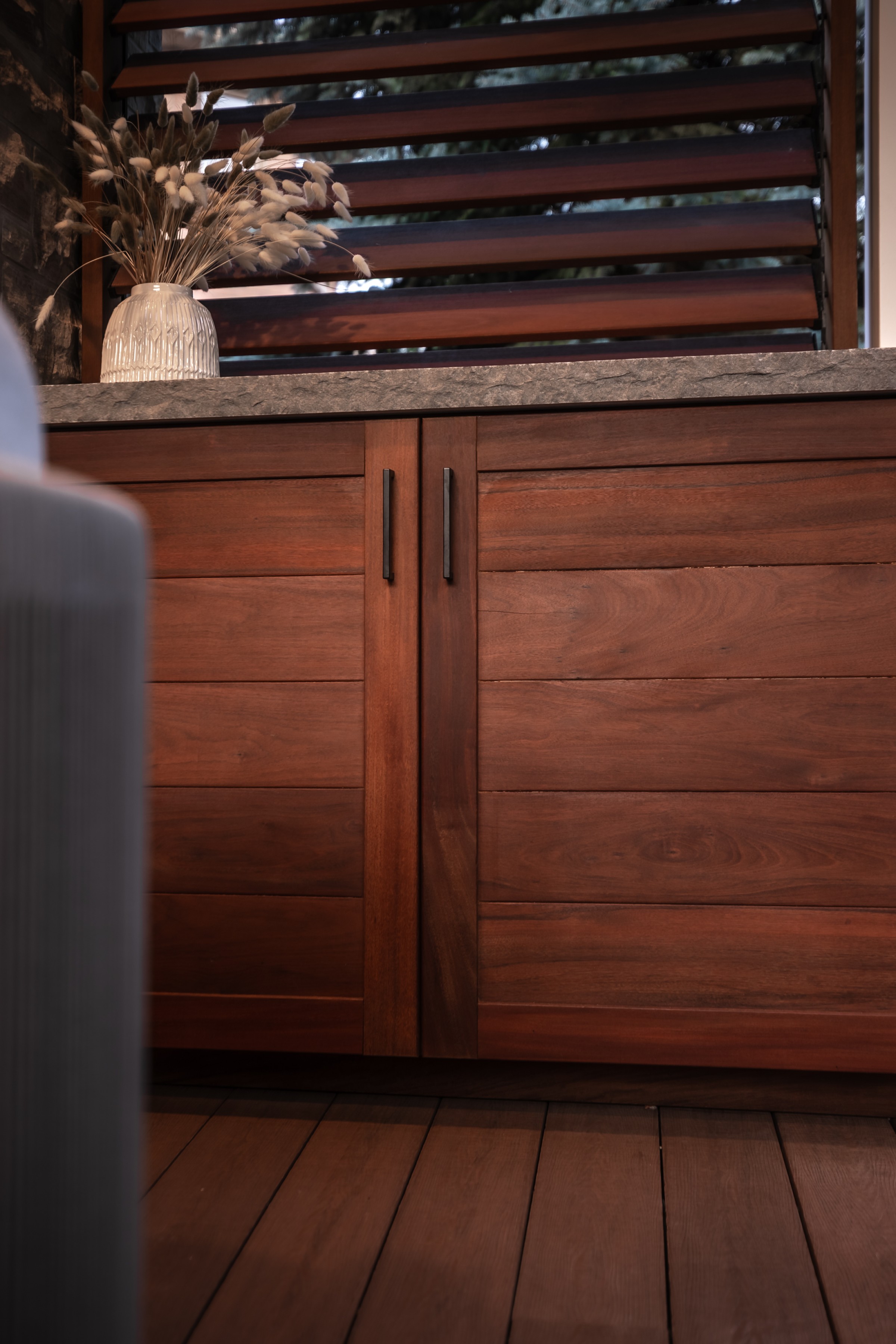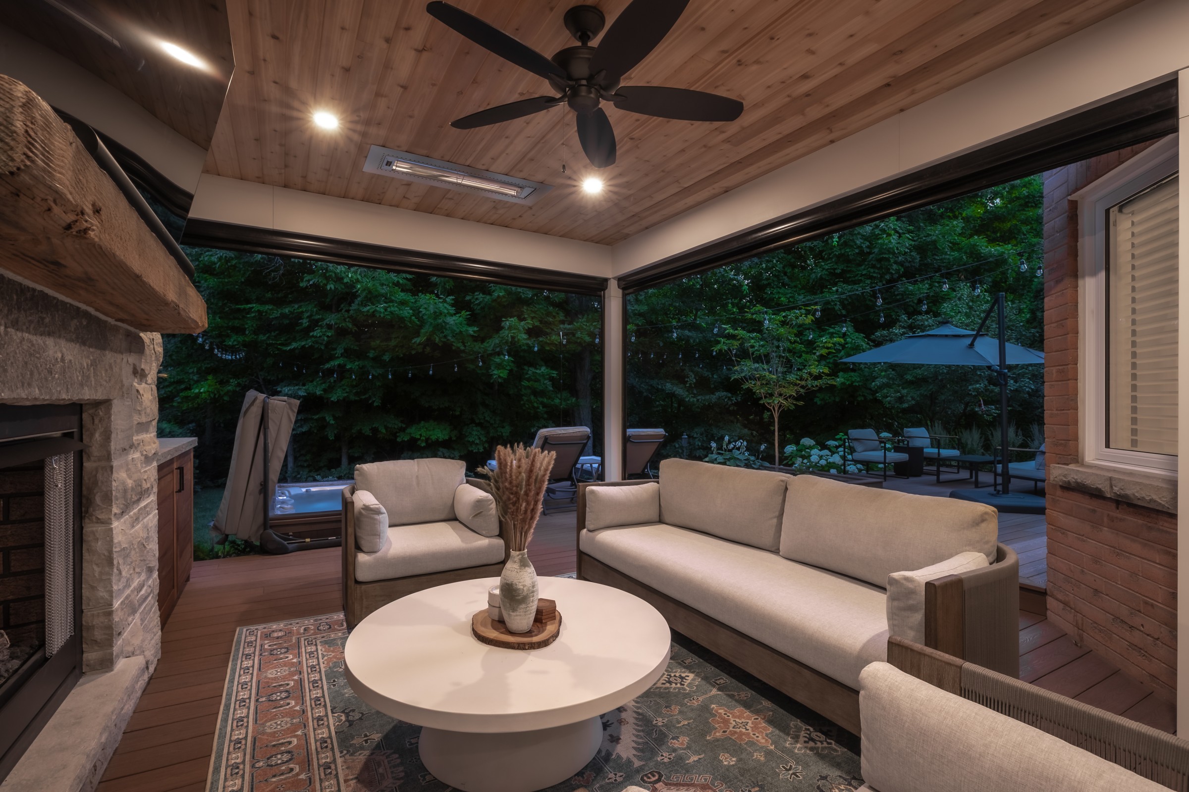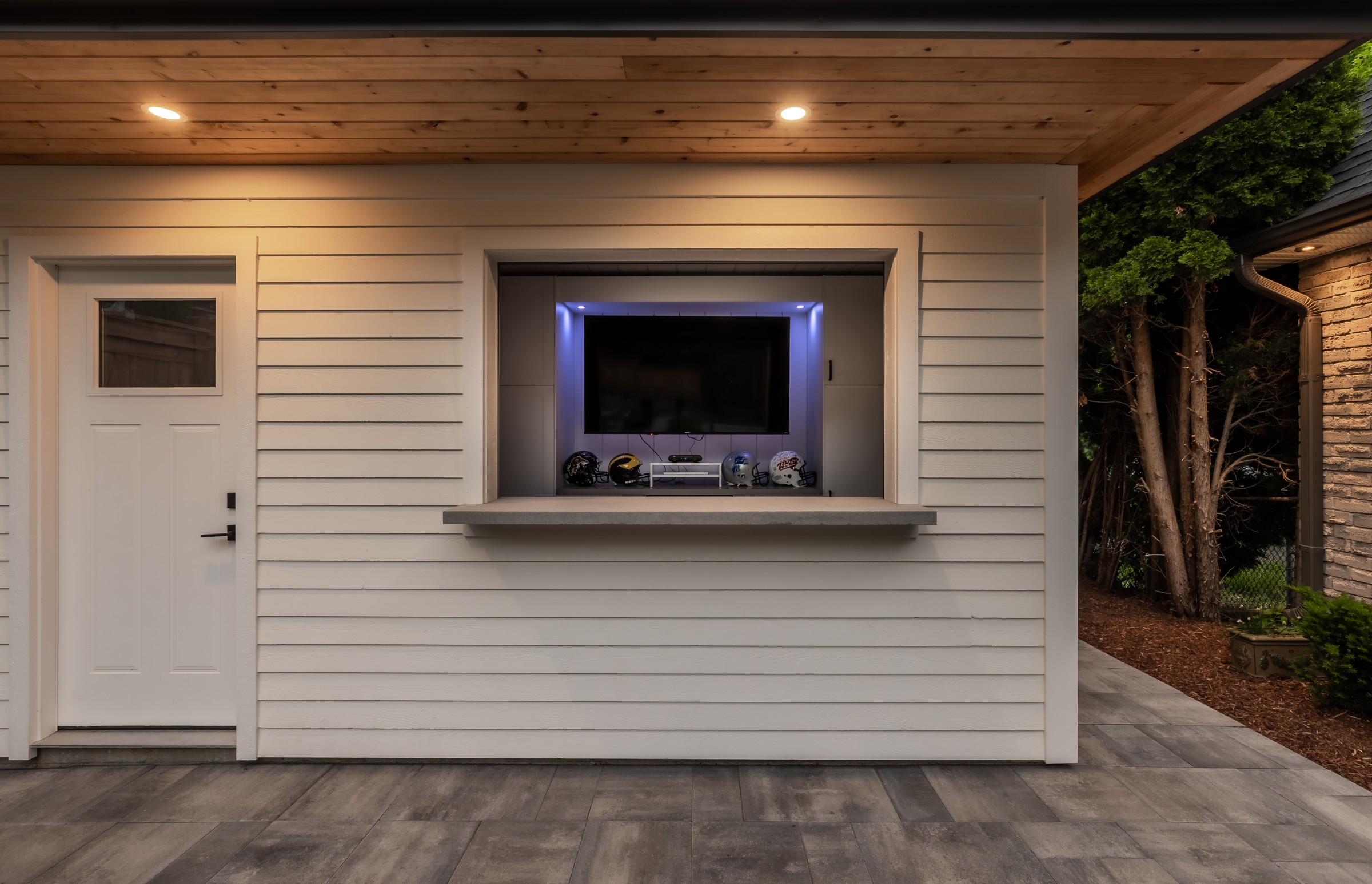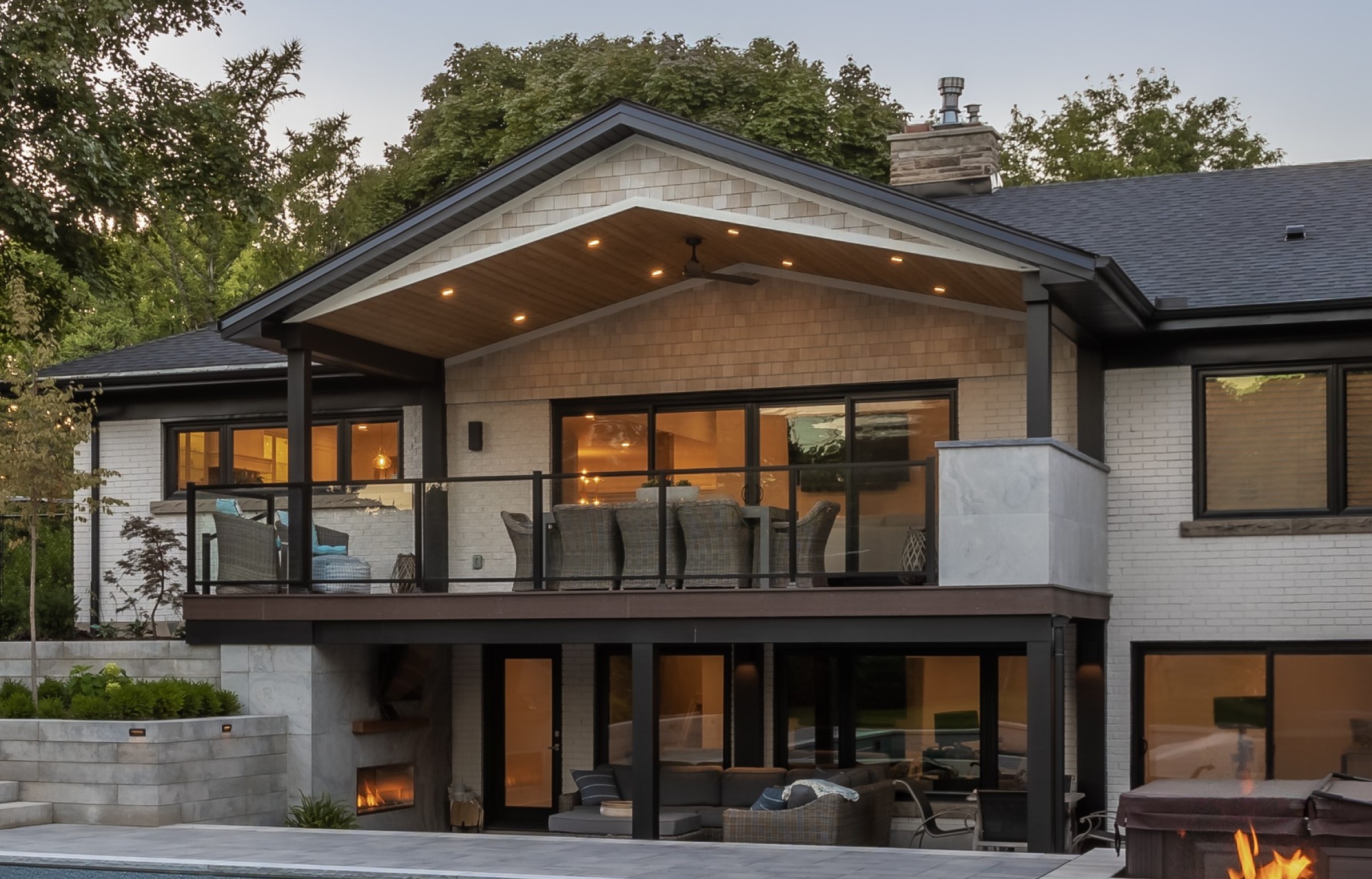 A sophisticated balance of comfort and style. Lush garden beds frame the home, leading to a warm deck retreat. Here, a fire and TV lounge invites relaxation, blending modern design with cozy intimacy for a luxury lifestyle beyond the pool.