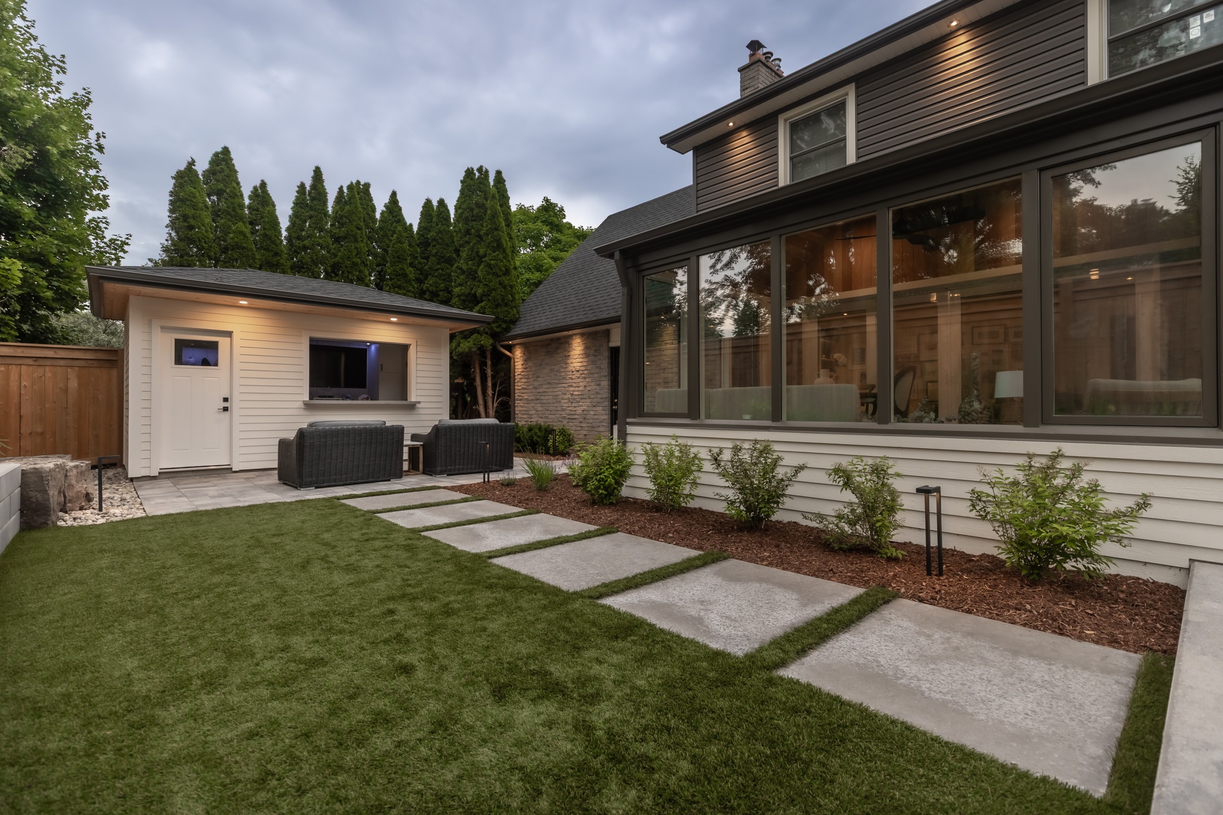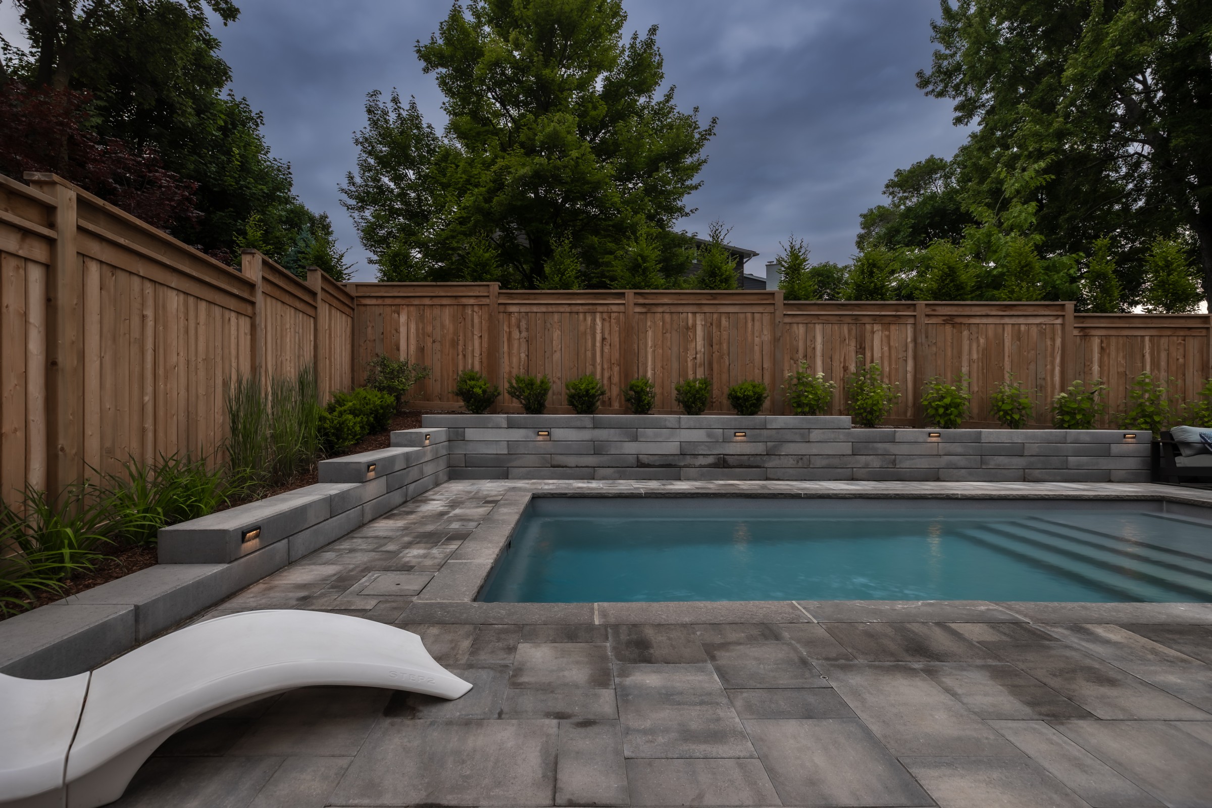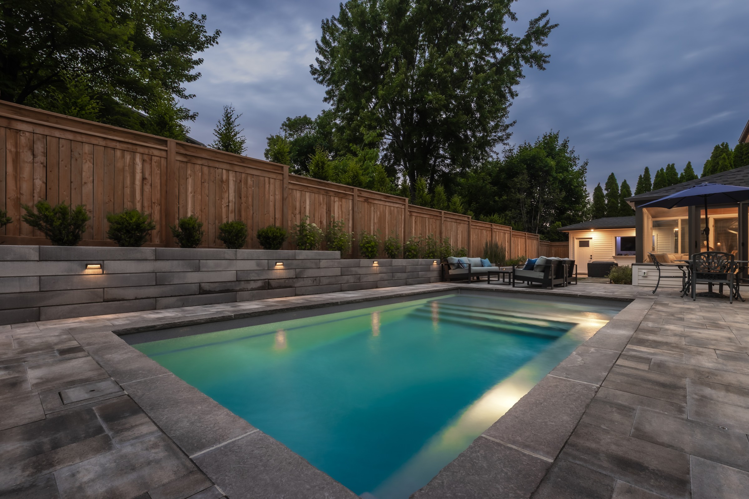 Maximizing every inch with intention, this design pairs sleek stonework with lush plantings and ambient lighting. A poolside cabana with bar seating and a tailored turf area unify leisure and function, delivering refined luxury with a confident, effortless charm.