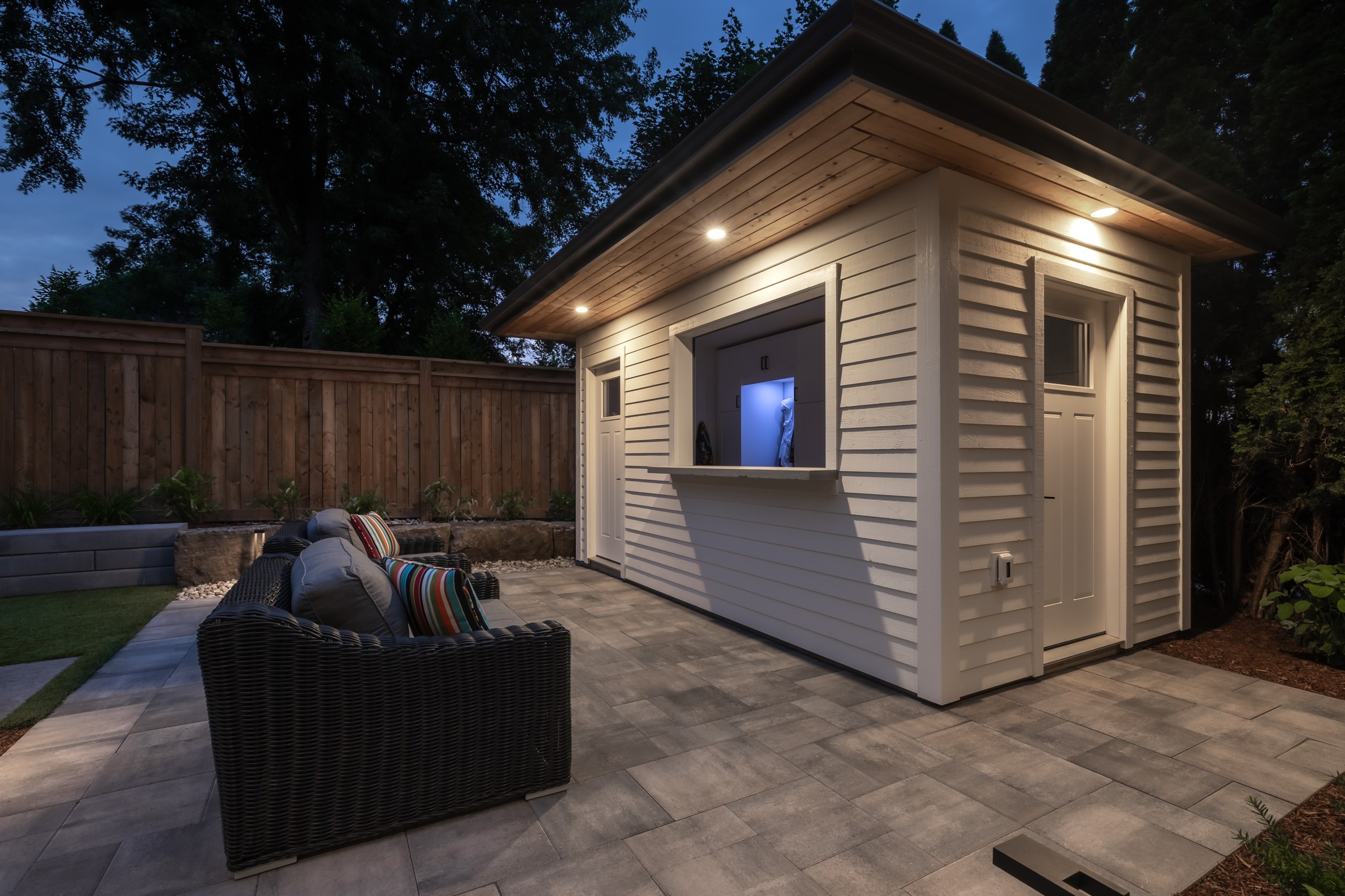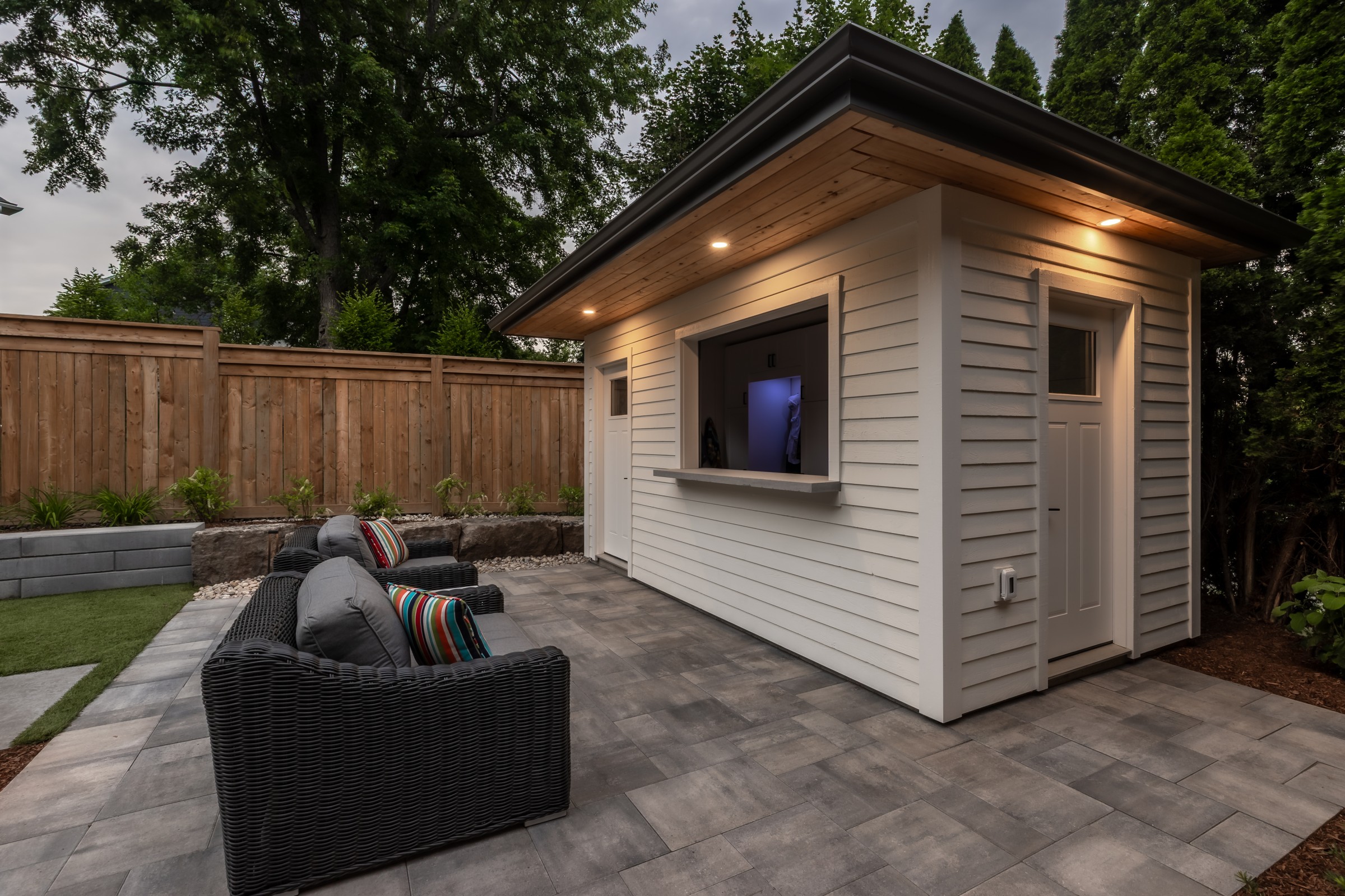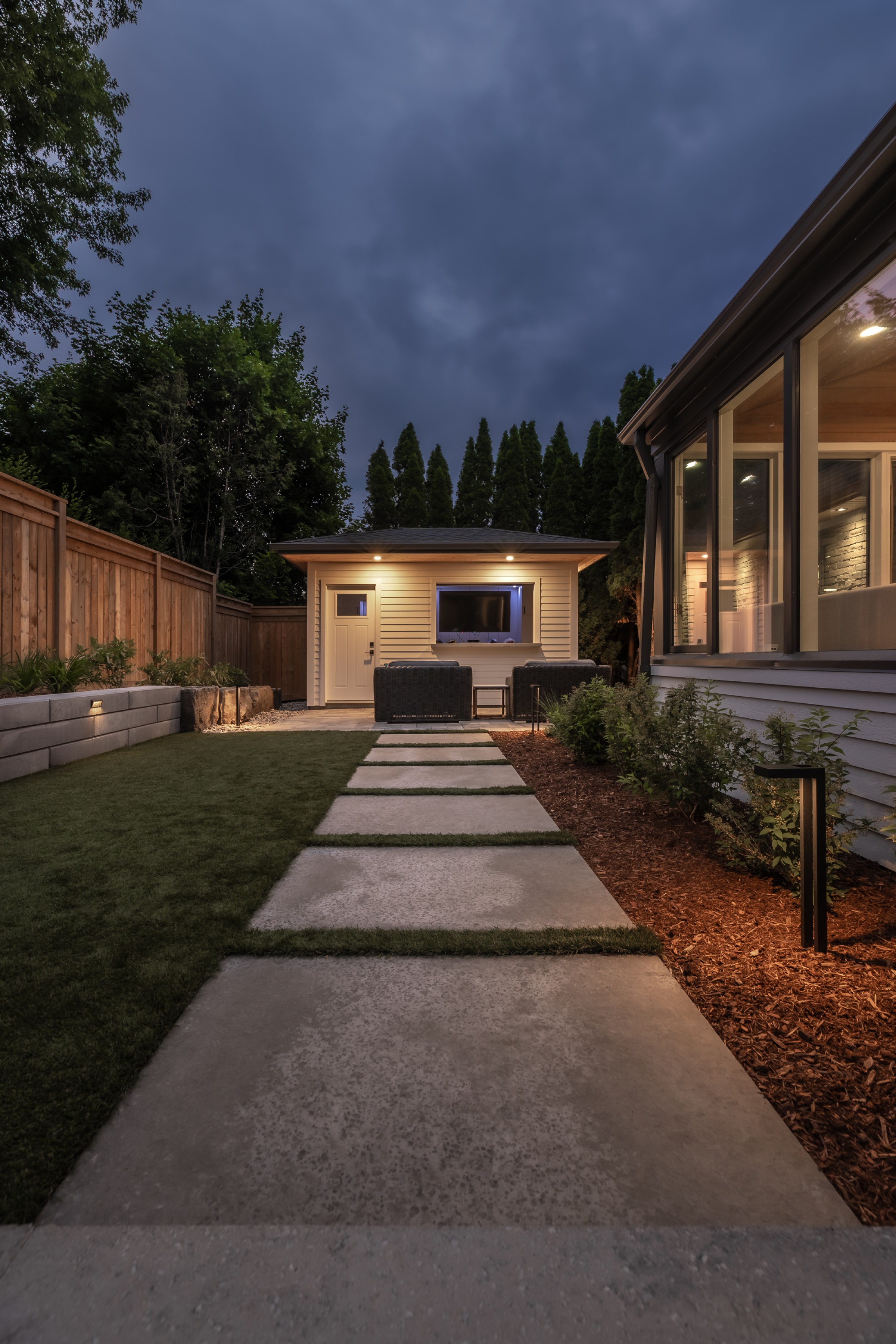 Maximizing every inch with intention, this design pairs sleek stonework with lush plantings and ambient lighting. A poolside cabana with bar seating and a tailored turf area unify leisure and function, delivering refined luxury with a confident, effortless charm.